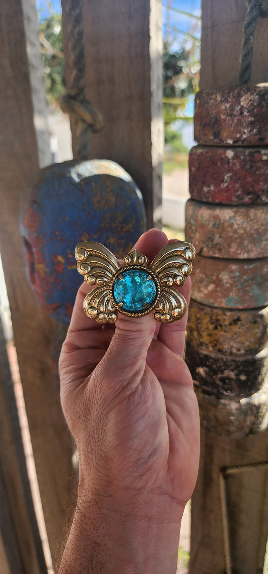This large-sized vintage novelty brooch is crafted in the shapely silhouette of an Art Deco butterfly, complete with exaggerated scrolling wings, raised bead detailing, and that old-world theatrical flair the 1920s did best.