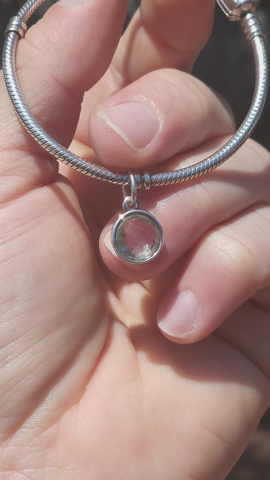 A beautifully wearable Pandora sterling silver snake chain bracelet, paired with a luminous prasiolite (green amethyst) dangle charm.