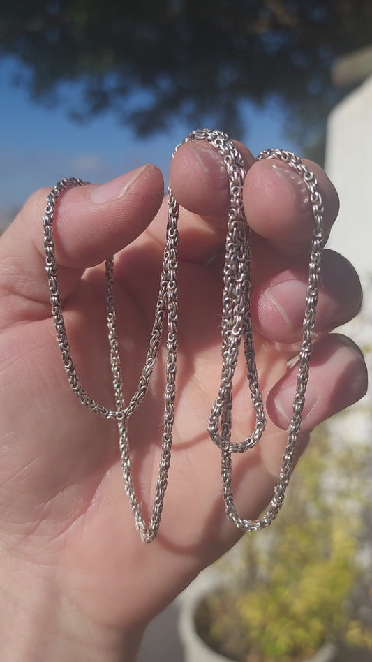 A marvelous vintage, extra-length solid sterling silver chain crafted in the intricate King’s Byzantine link, one of the most complex and visually rich chain designs in jewellery history.