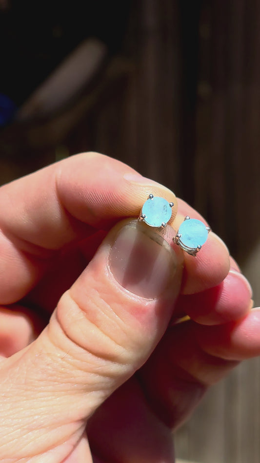 This striking pair of unisex sterling silver stud earrings features round faceted aquamarine gemstones in a soft milky / opaque tone — giving them a dreamy, sea-glass quality rather than a fully transparent sparkle.