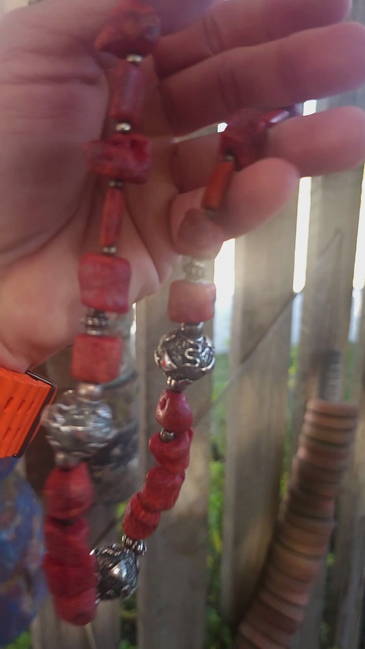 This chunky artisan-made necklace is crafted in solid sterling silver and strung with beautifully irregular, semi-polished natural Mediterranean coral beads.