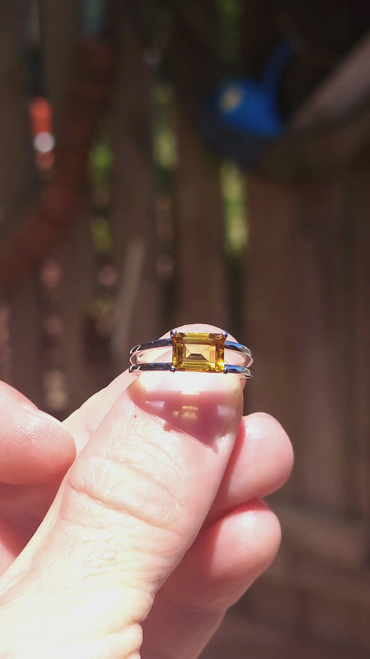 This beautiful sterling silver solitaire ring features a striking emerald-cut citrine, glowing in rich golden-orange tones.