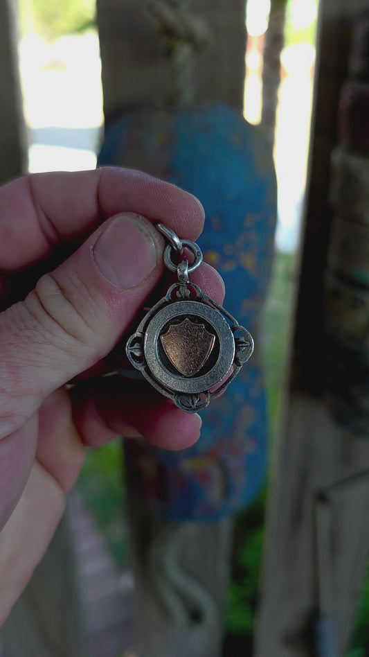 A beautiful antique hallmarked fob shield pendant, crafted in sterling silver and decorated with a raised 9ct rose gold shield cartouche, creating a striking and elegant two-tone contrast.