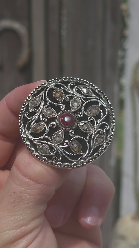 This extraordinary round brooch is crafted in 800-grade silver and represents traditional Javanese / Indonesian silversmithing, dating to the late Victorian period (late 1800s)