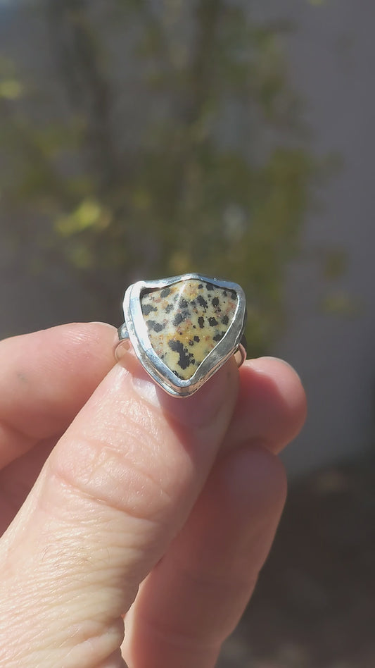 A striking artisan-made sterling silver dress ring, designed around a beautifully irregular, organically shaped Dalmatian Jasper cabochon.