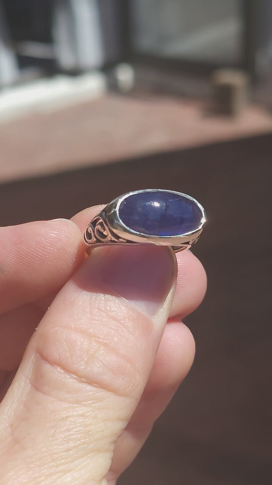 A striking unisex sterling silver dress ring showcasing a generously sized oval blue sapphire cabochon as its commanding centrepiece