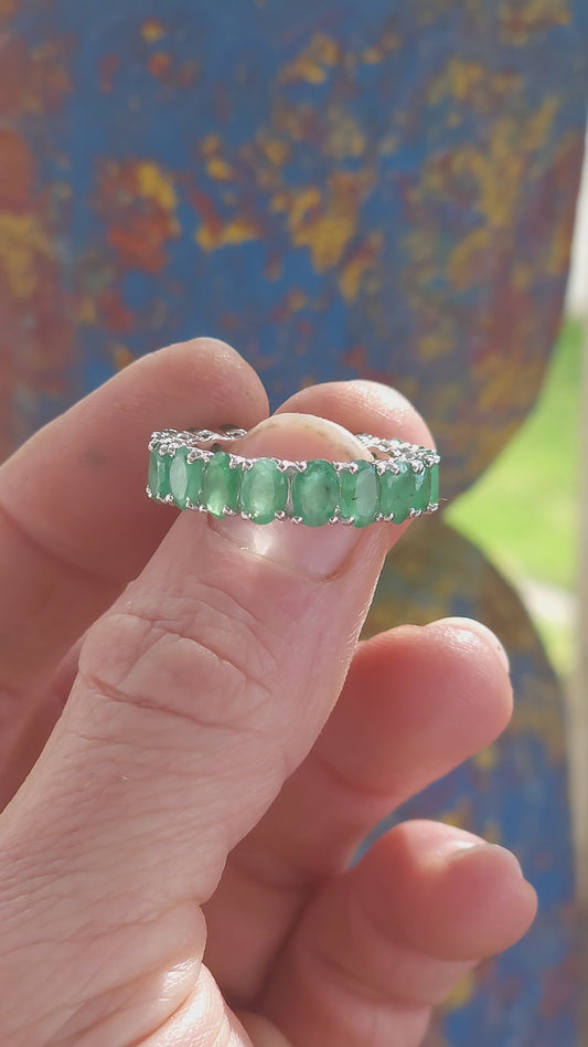 This glorious unisex sterling silver full eternity ring is a never-ending parade of 18 glowing oval-cut emeralds.