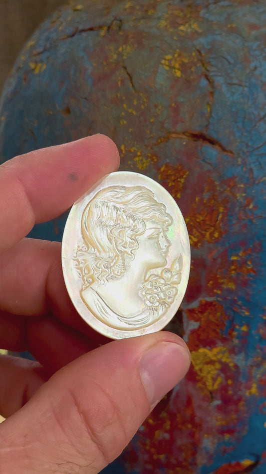 This beautiful vintage cameo is hand carved from luminous mother of pearl, displaying the soft iridescent glow that makes this material so prized in cameo carving.