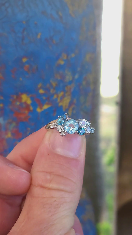 Crafted in solid sterling silver and finished with rhodium plating for a bright, tarnish-resistant white-gold look, this ring is a tribute to the beauty of topaz in all its shades of blue.