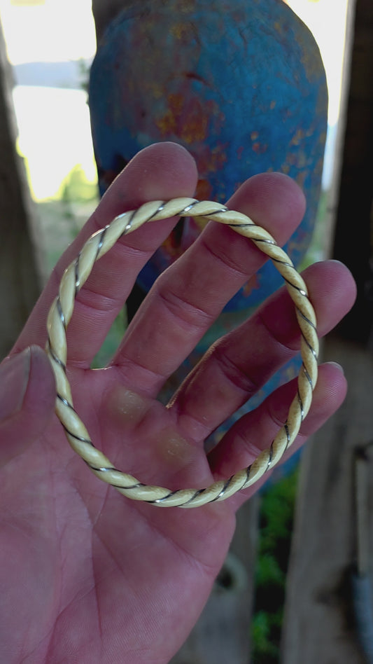 A beautiful antique hand-carved ivory bangle, crafted in a graceful twisted rope / swirl pattern and delicately wrapped with fine sterling silver wire that spirals along the entire circumference of the bracelet.
