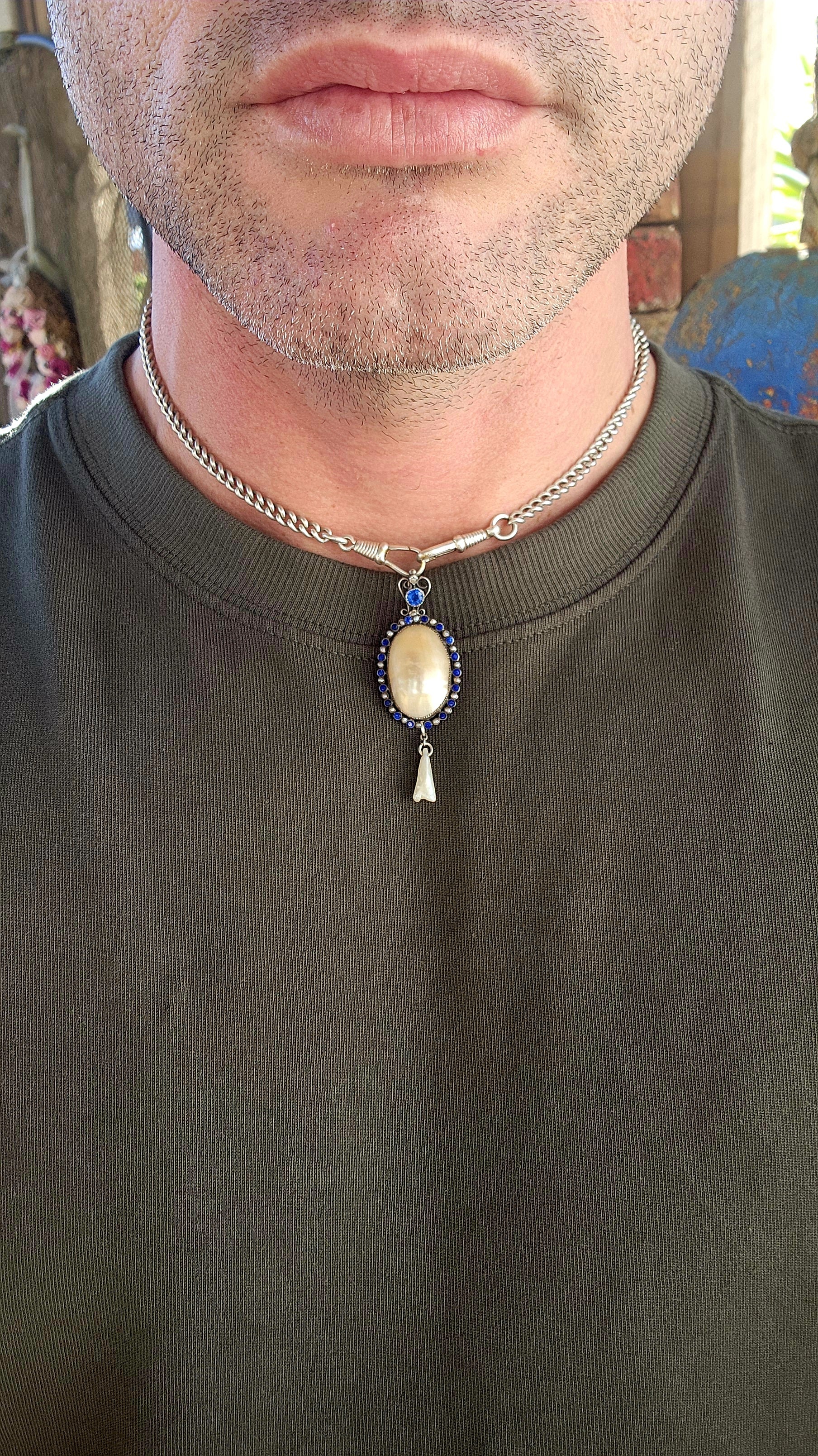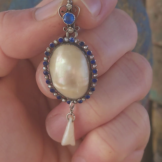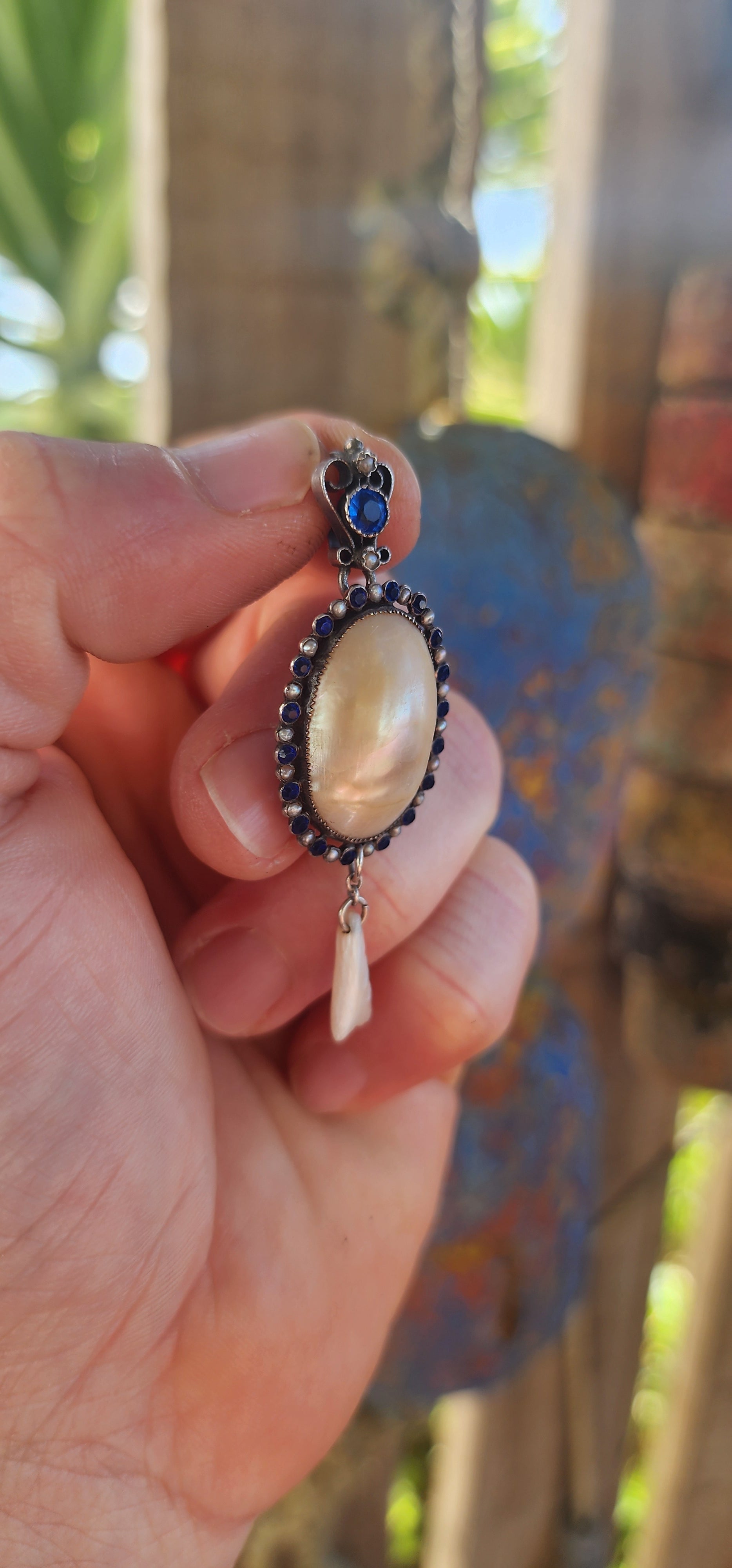 This pendant perfectly bridges Romanticism and Symbolism, two key influences in Art Nouveau jewelry. The luminous mother of pearl evokes the goddess Selene and the flow of oceanic life, while the deep faux sapphire tones signify wisdom, sincerity, and spiritual insight. Together, they create a talisman of serenity and protection.