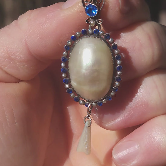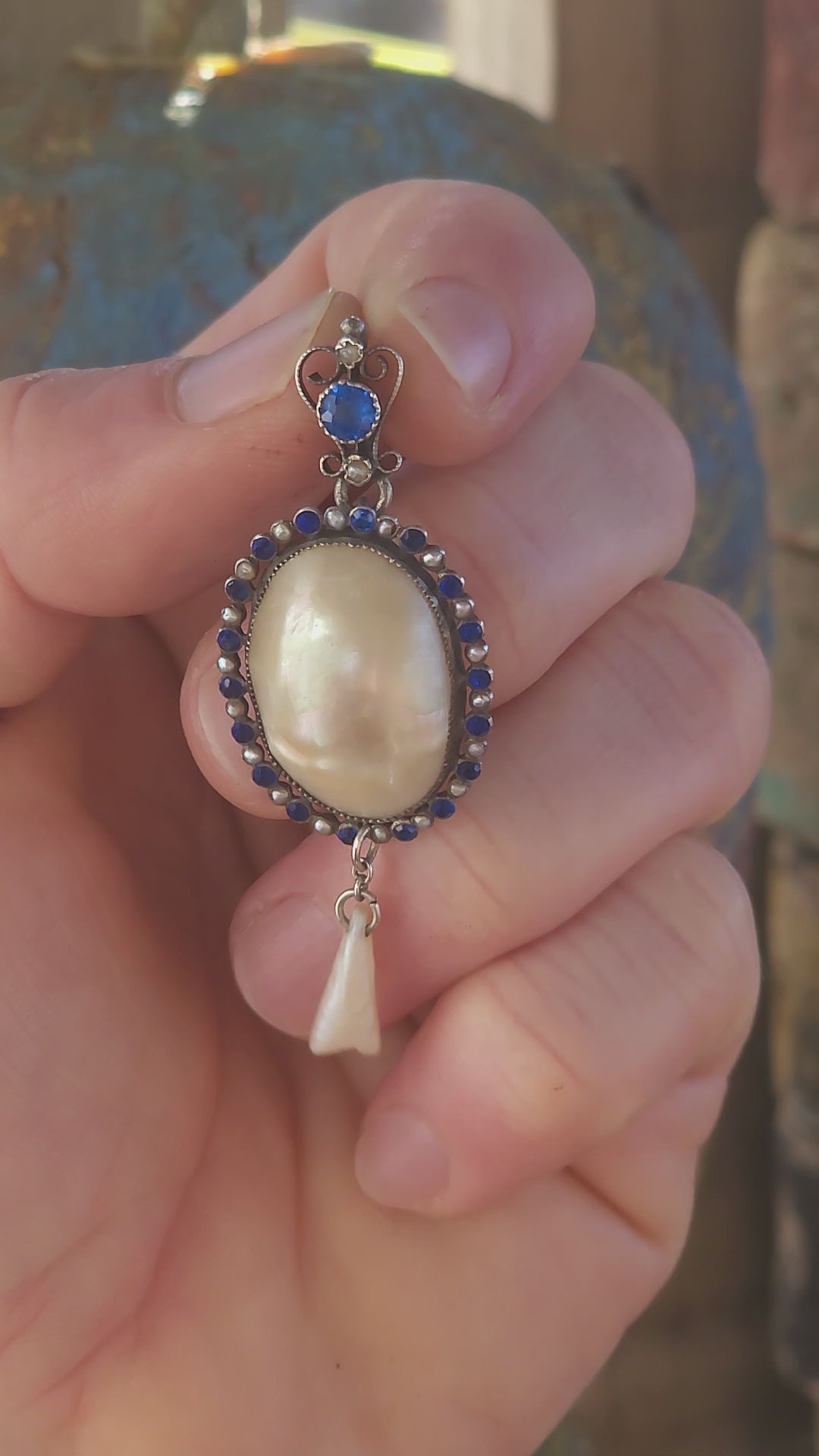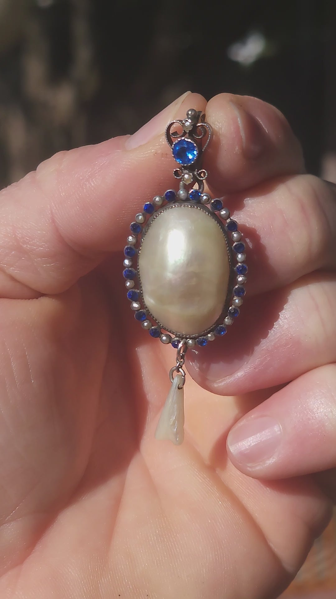 The pendant begins with a beautifully ornamental bail, set with a round-cut faux sapphire and two dainty seed pearls — a quintessential Art Nouveau pairing symbolizing purity and intuition. Dangling gracefully below is a large oval mother-of-pearl cabochon, glowing with its natural iridescent sheen, representing the moon’s divine feminine energy. This centerpiece is encircled by a delicate halo of faux sapphires and tiny seed pearls, echoing the celestial color palette beloved by turn-of-the-century artisans.