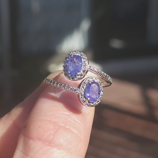 At the heart of this jewel rest two mesmerizing oval-cut tanzanite gemstones, their violet-blue hues shifting like twilight skies — at once mysterious, luminous, and endlessly enchanting. Each tanzanite is haloed by a constellation of sparkling cubic zirconia, amplifying the natural fire of the center stones while casting a brilliant aura of light.