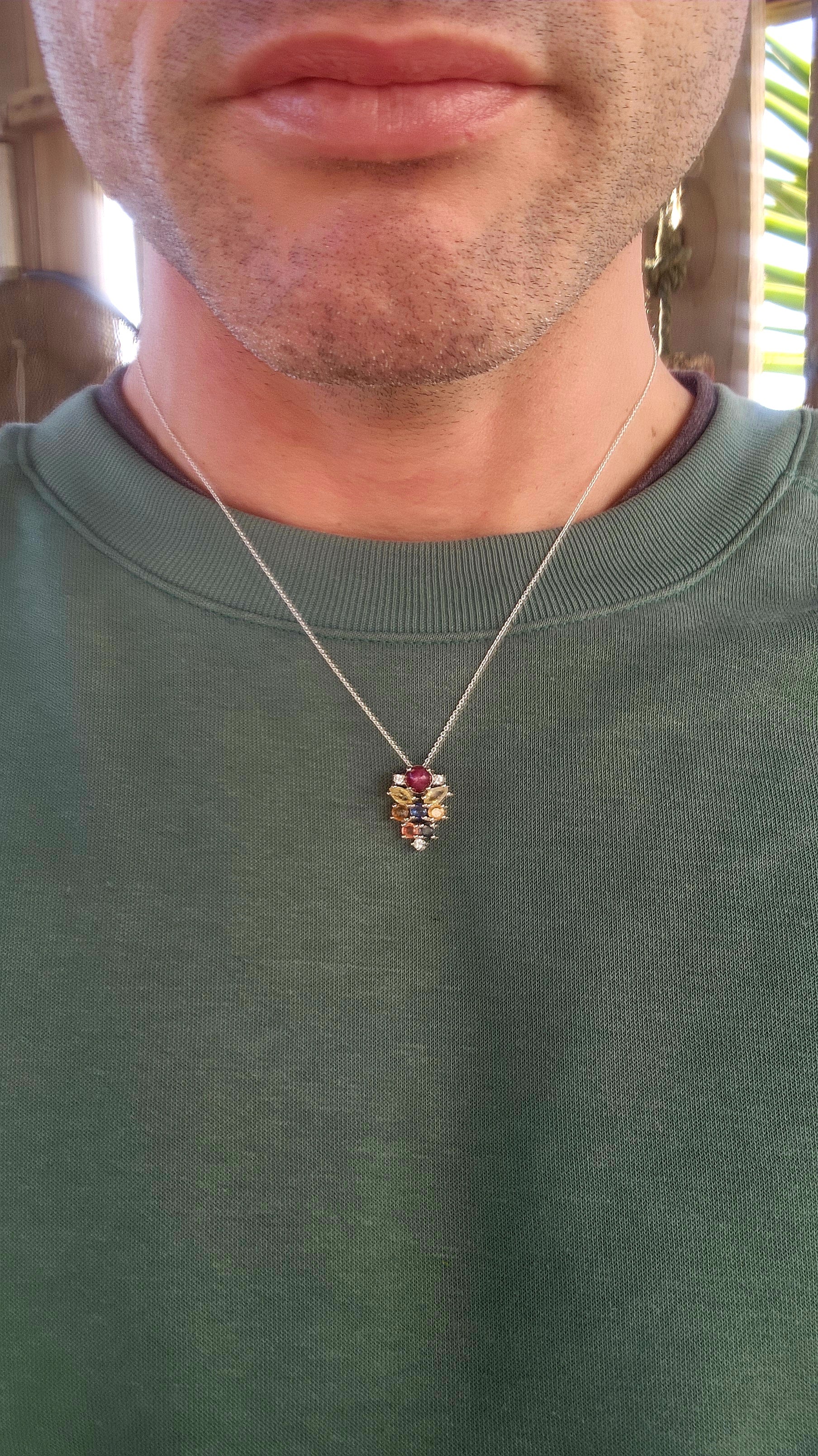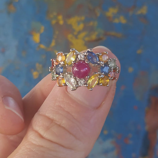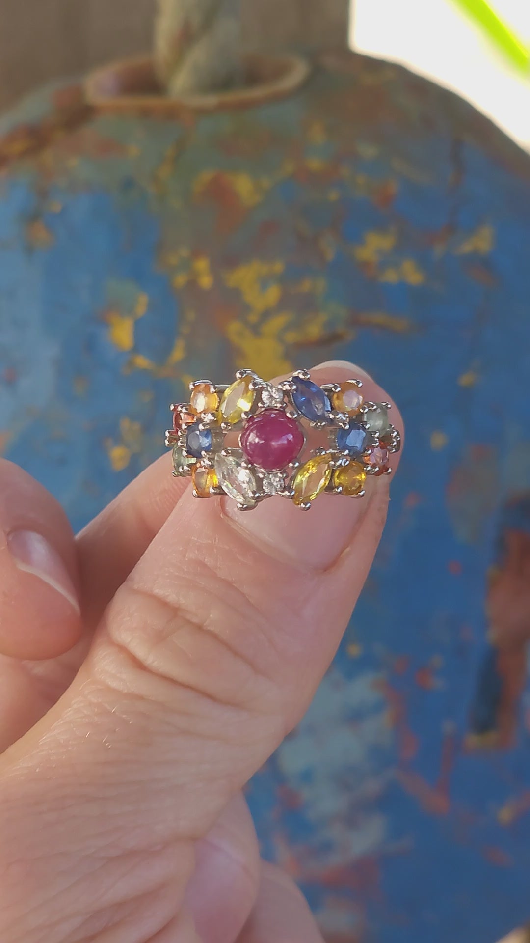 Encircling this celestial centerpiece is a kaleidoscope of multicolor sapphires in round, and marquise cuts. Shades of sunny yellow, velvety blue, warm orange, and leafy green sparkle in harmony, forming a gemstone garden around the ruby’s glowing heart.