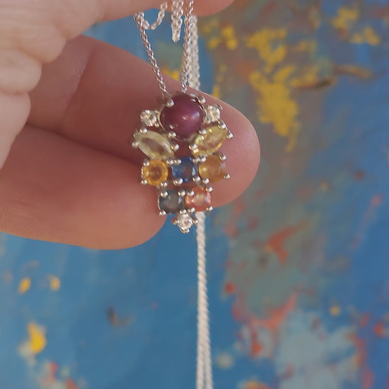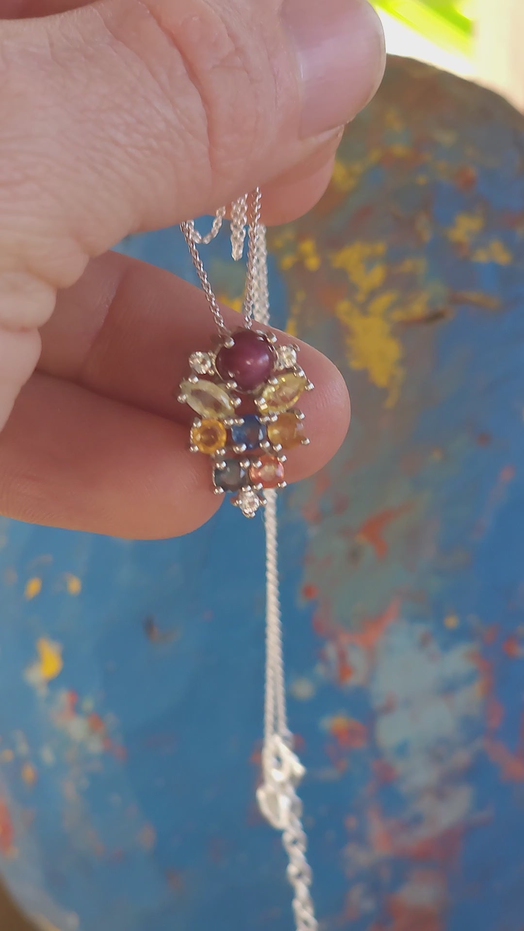 The matching pendant mirrors the design of the ring, also featuring a central star ruby cabochon framed by an array of vibrant sapphires. Suspended from a fine adjustable-length sterling silver chain.