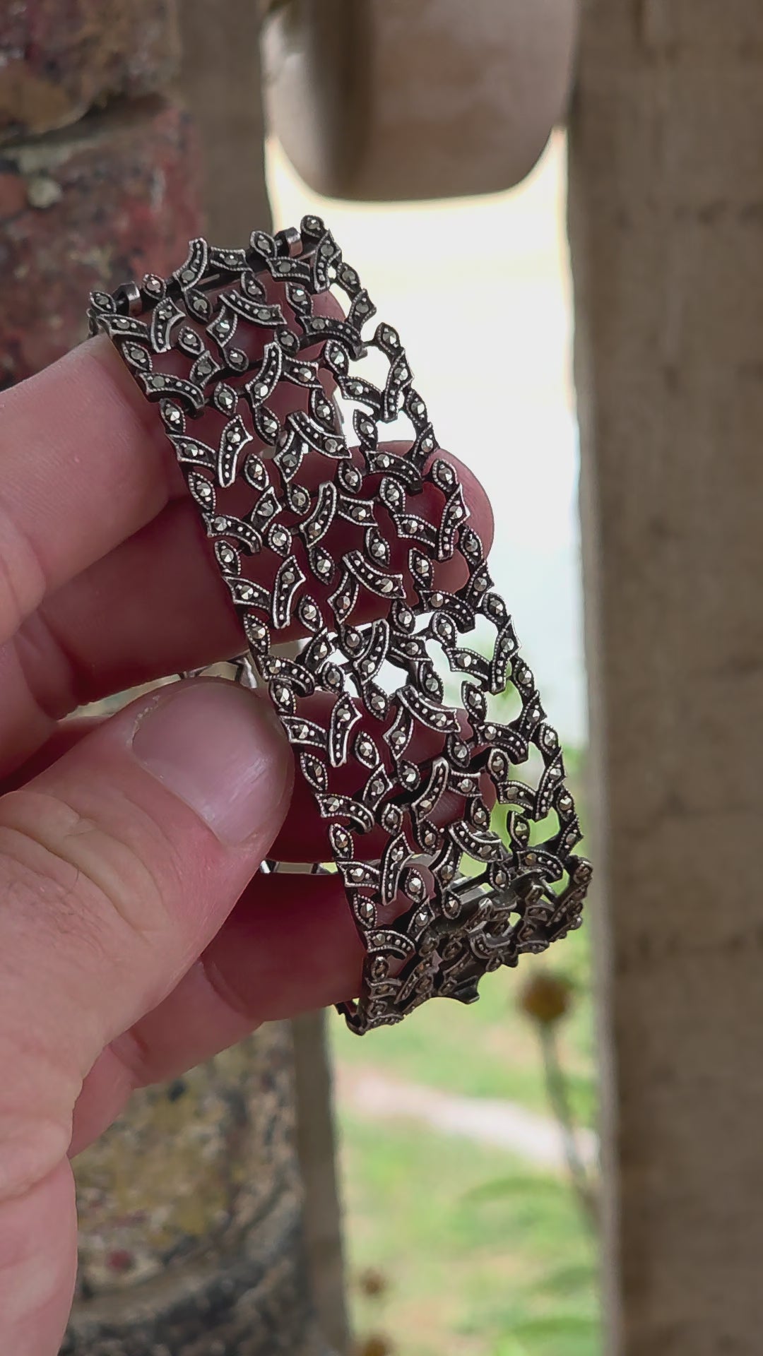 Every panel is densely studded with tiny prong-set marcasites, creating a soft metallic sparkle.