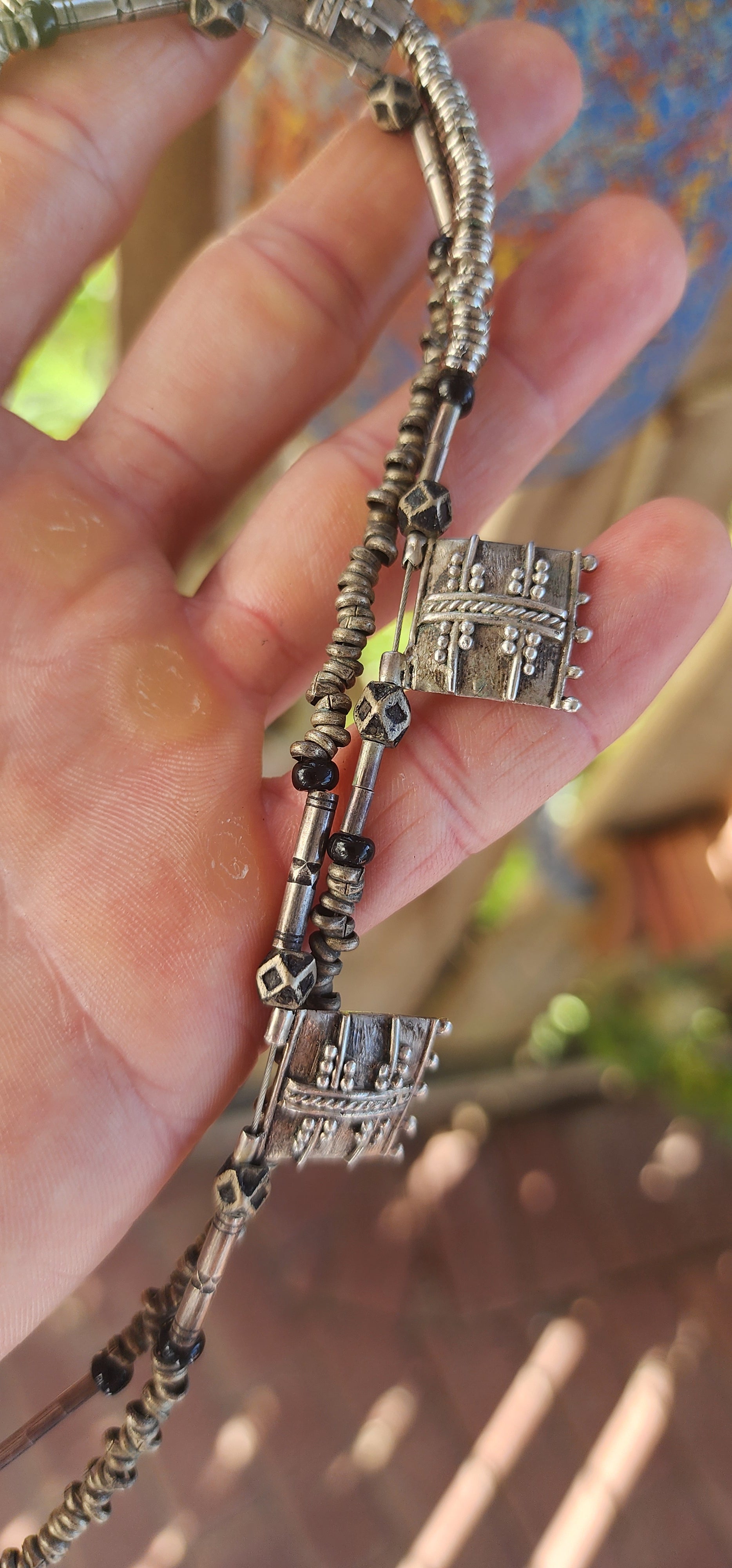 Interspersed throughout the strand are small black glass spacers, lending contrast and rhythm to the silverwork, while the necklace is further elevated by a series of square sterling silver pendants. These pendants, adorned with embossed and granulated decoration, echo the amuletic forms worn across Ethiopia, where jewelry has long served not only as ornament but also as a talisman of protection and cultural identity.