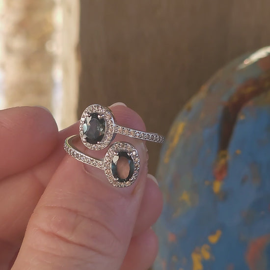 Each topaz is framed in a delicate halo of sparkling cubic zirconia, a constellation of brilliance that amplifies the dark mystery of the center stones. The shimmer continues down the bypass shoulders, with pavé-set CZ gemstones creating a radiant path of fire and ice.