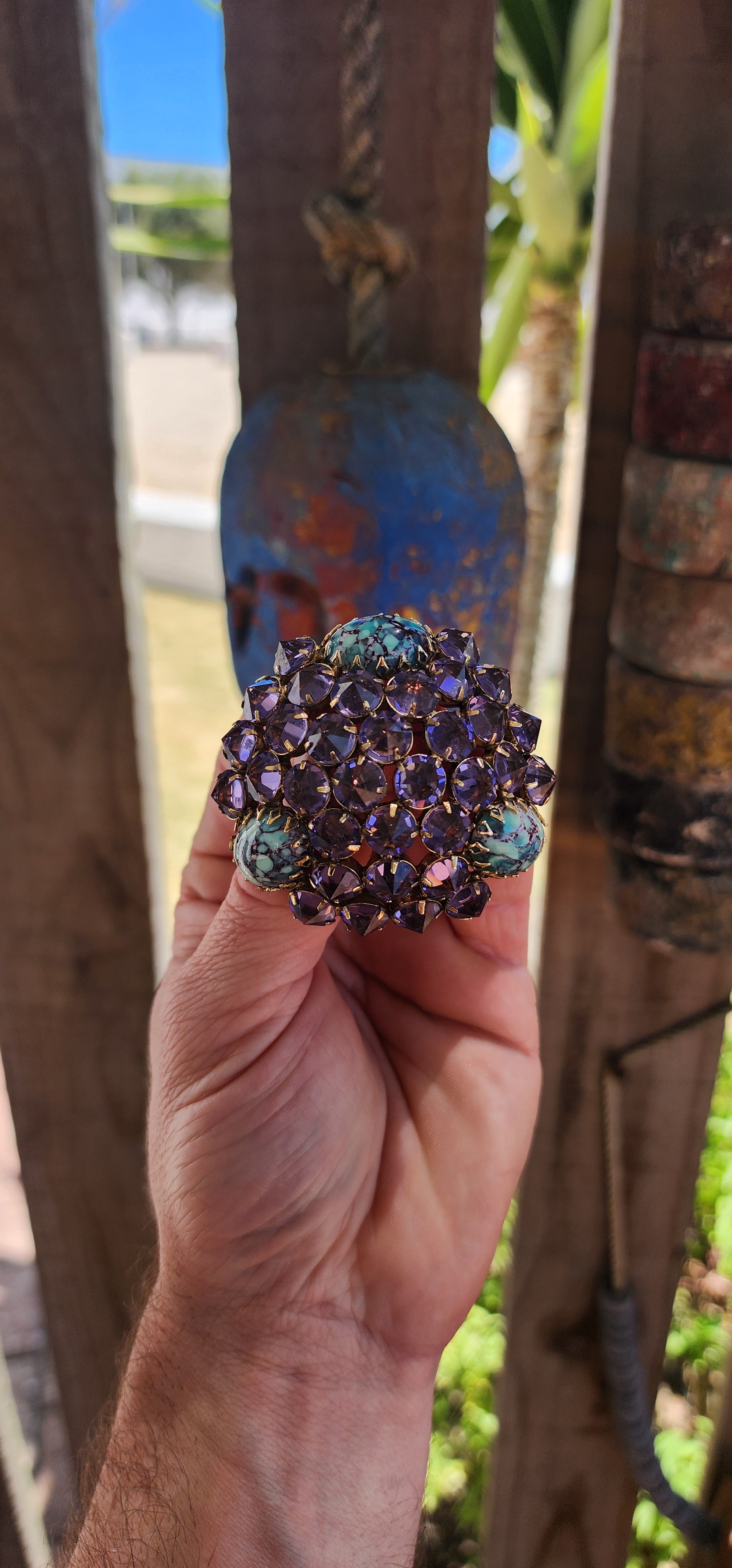 Sparkling rounds of faux amethyst glass rhinestones, each reverse-set with the pointed “culet” facing upward — one of Schreiner’s signature design hallmarks, giving off a hypnotic kaleidoscope of deep lavender and violet flashes.