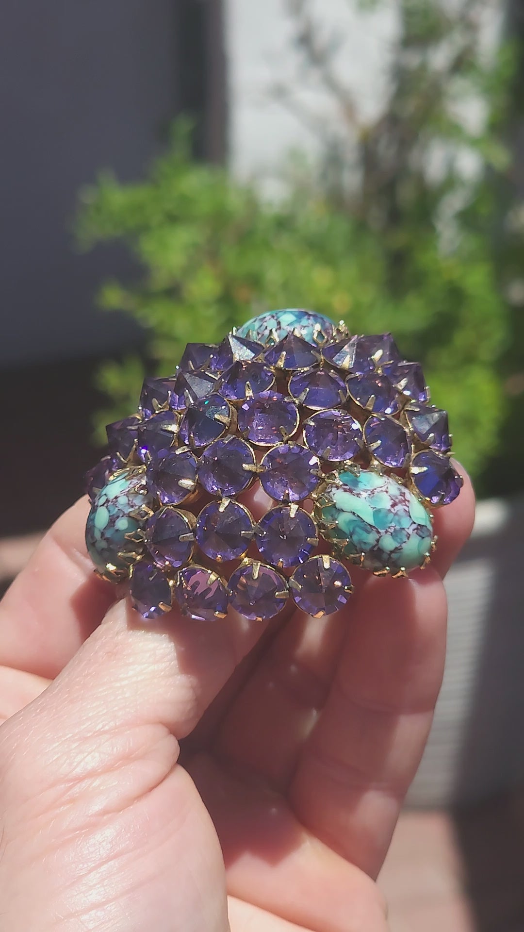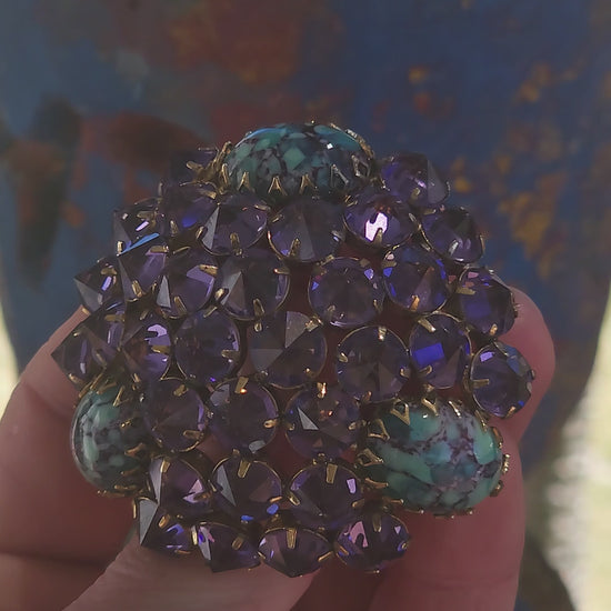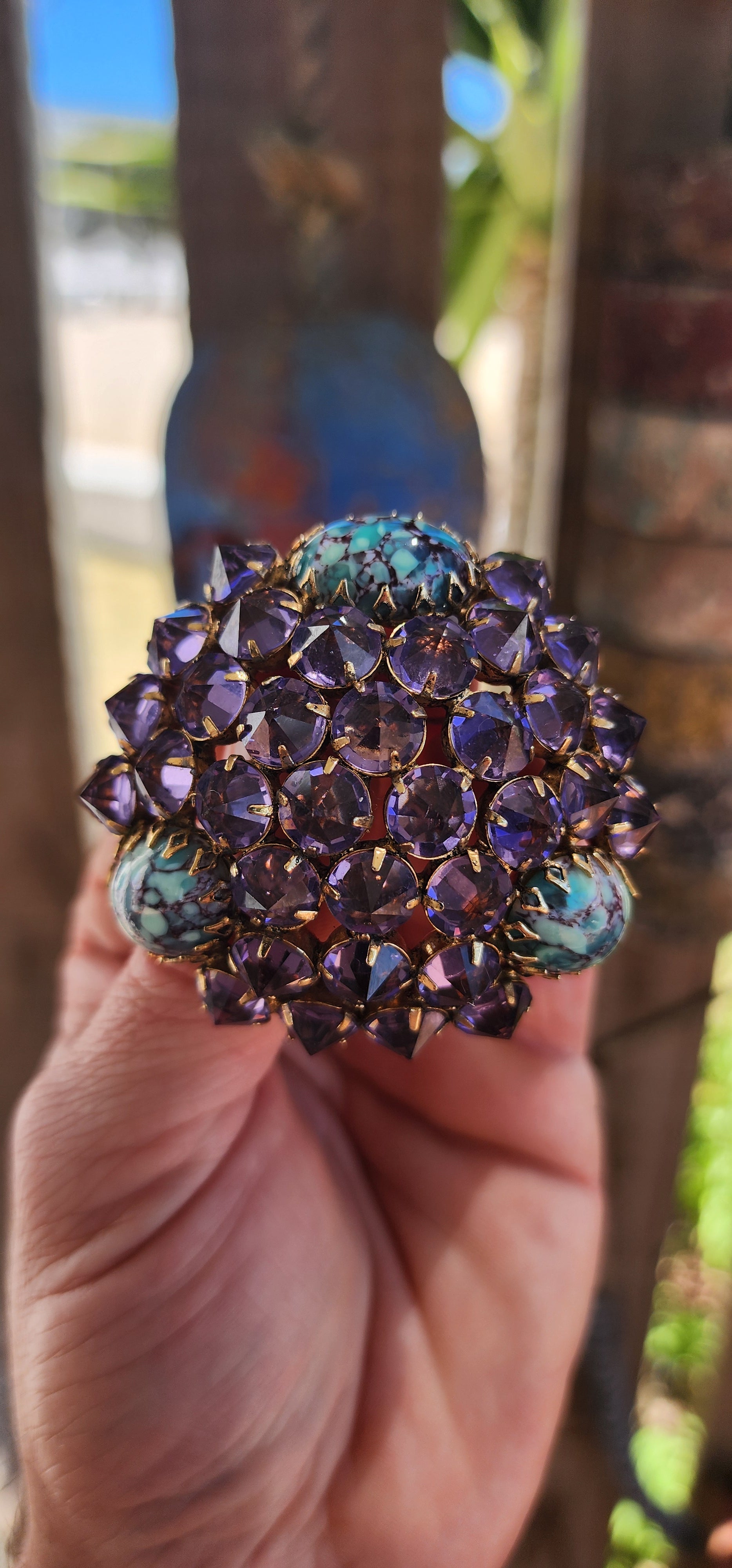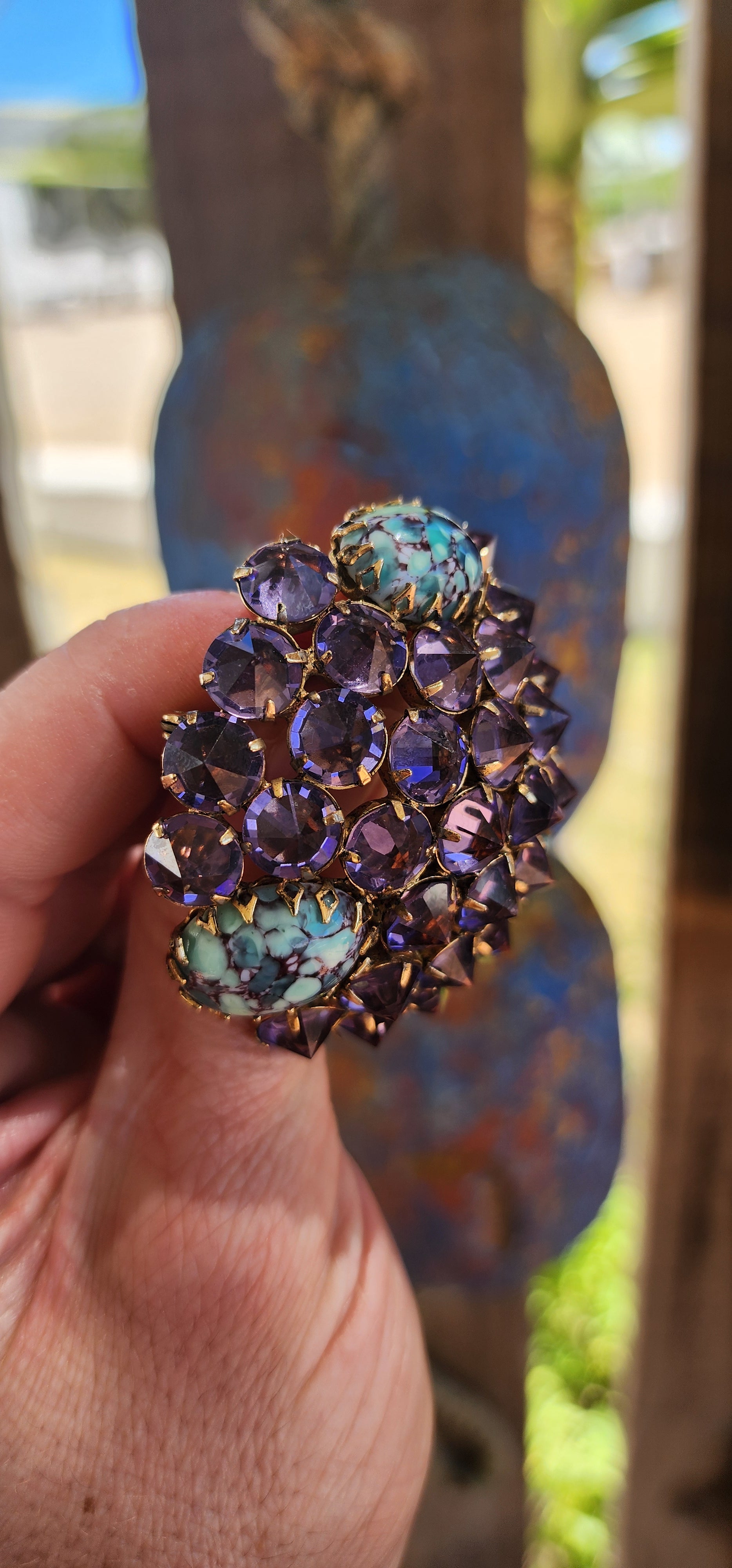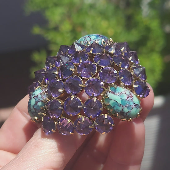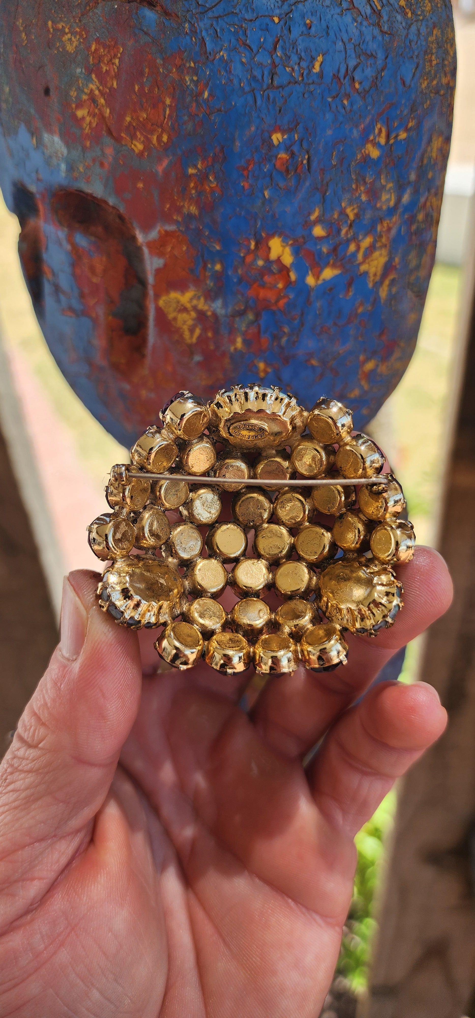 Up for grabs is an exceptionally rare and very large vintage 1950s designer costume brooch by none other than the iconic Schreiner of New York — proudly signed on the reverse. Schreiner pieces are the holy grail of mid-century costume jewellery, and this treasure is one of the most breathtaking examples you will encounter.