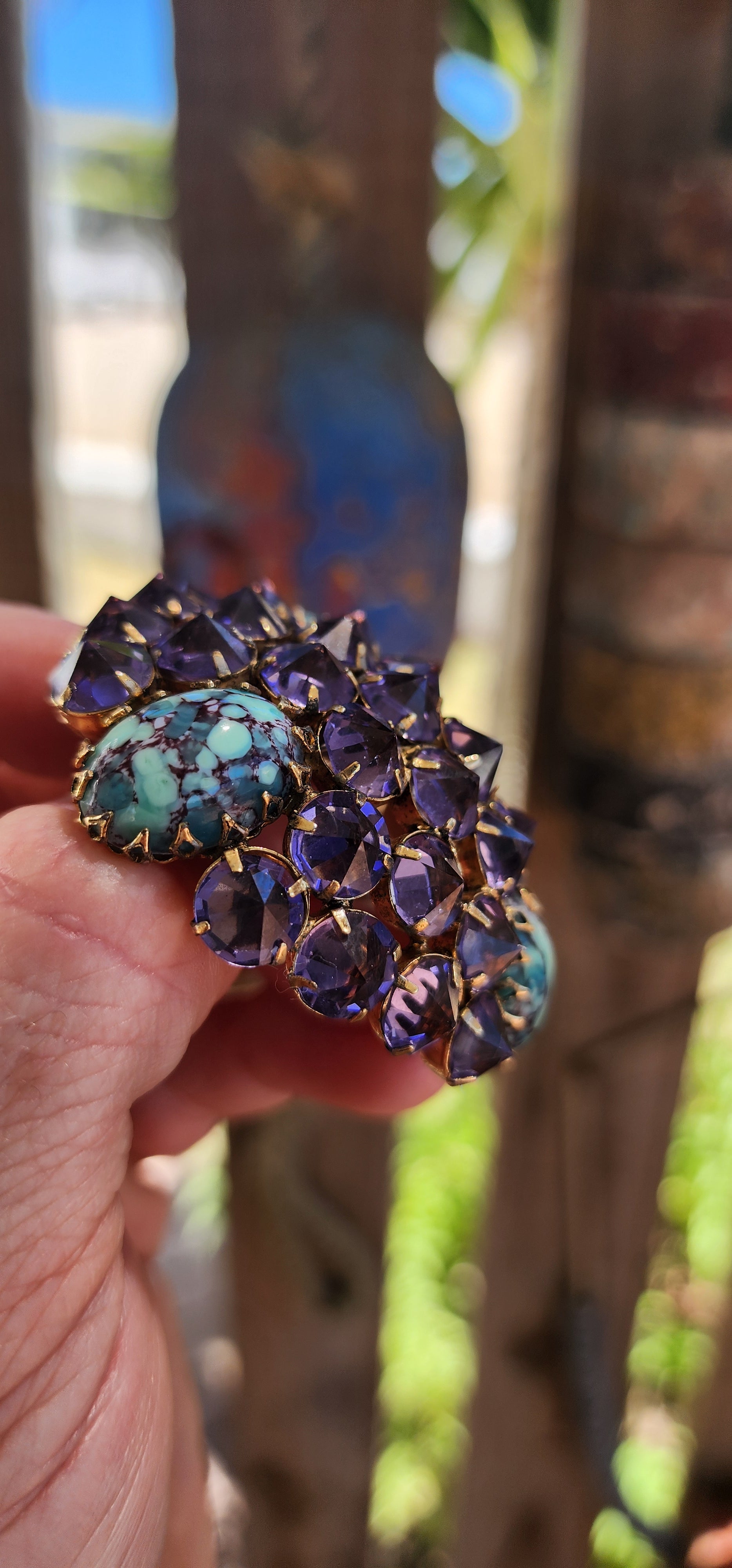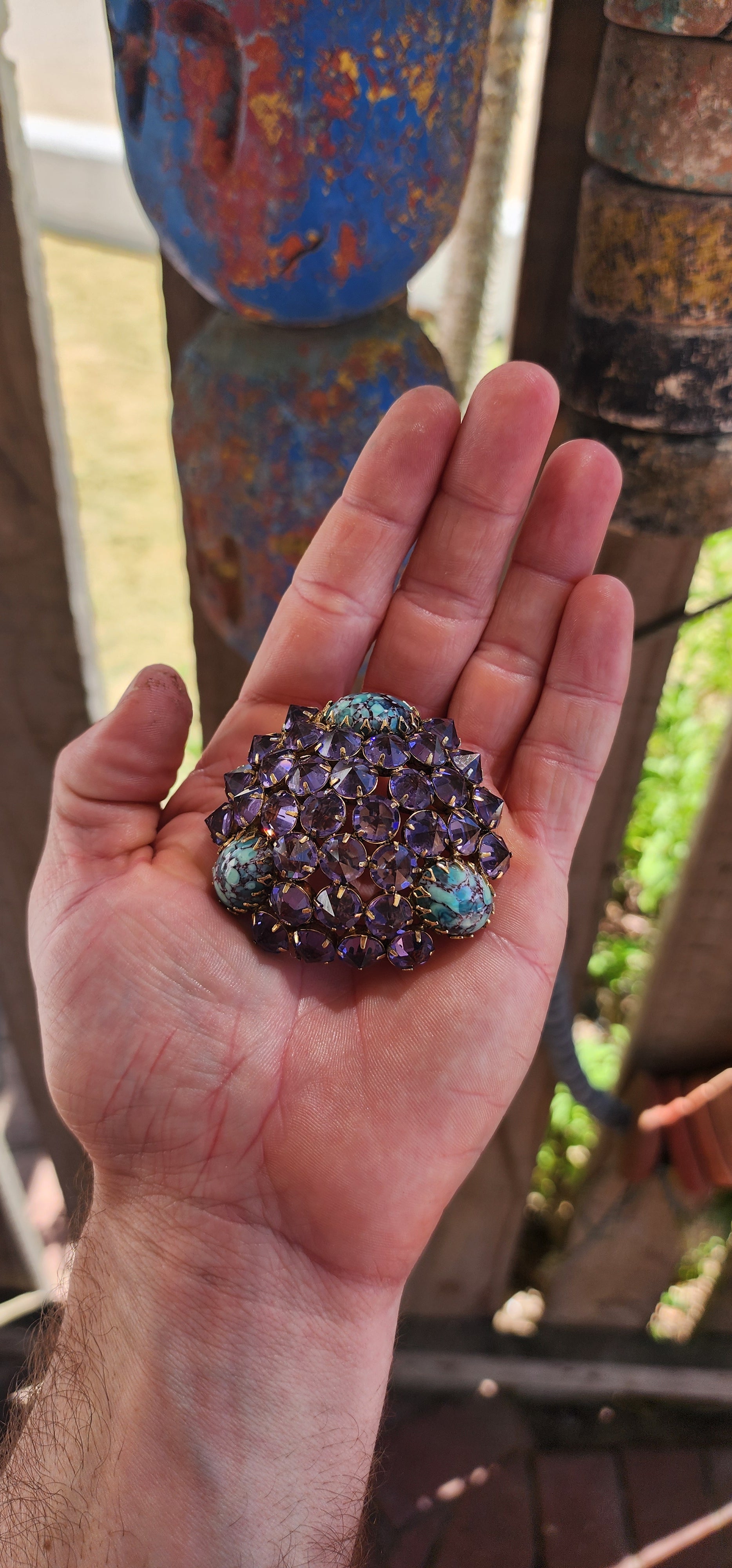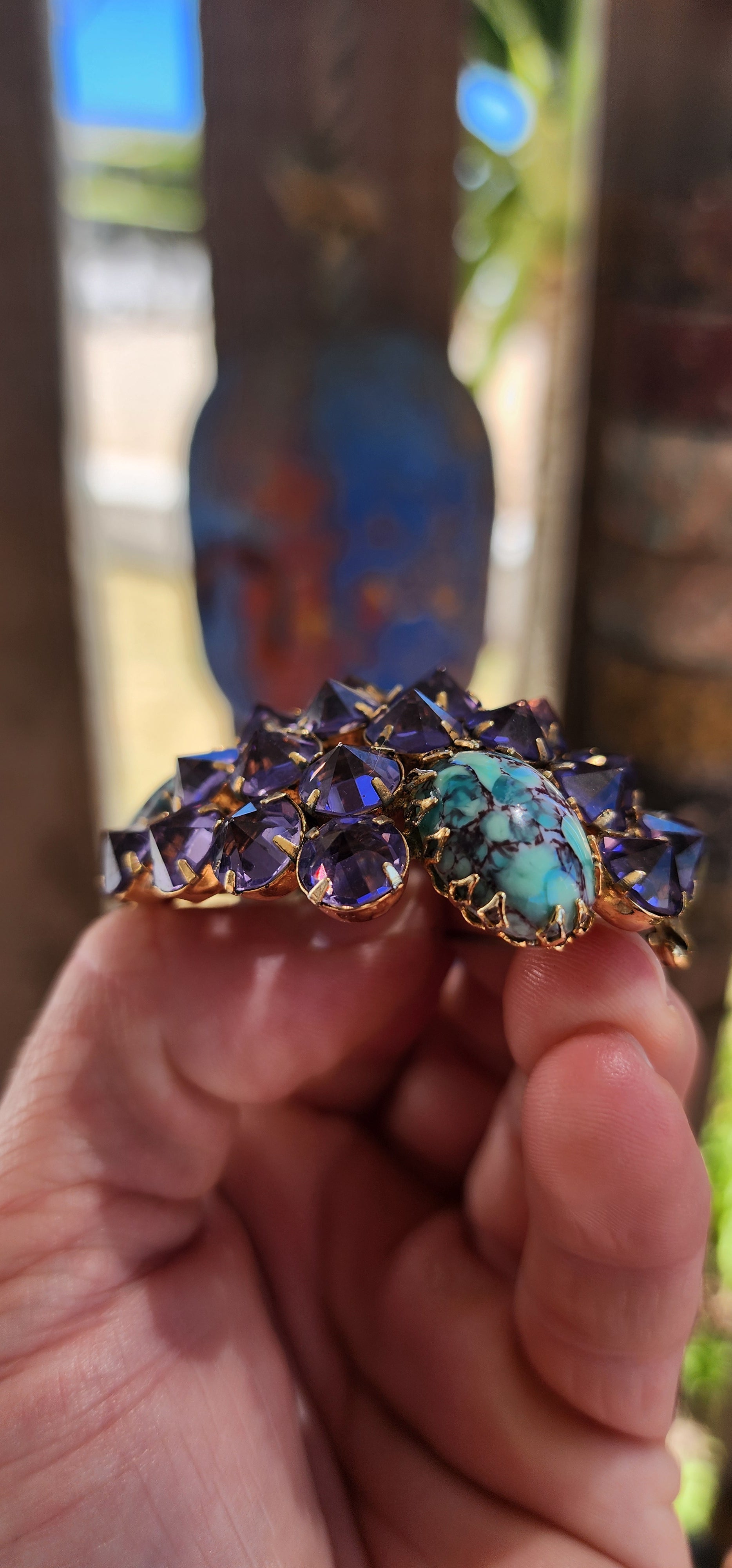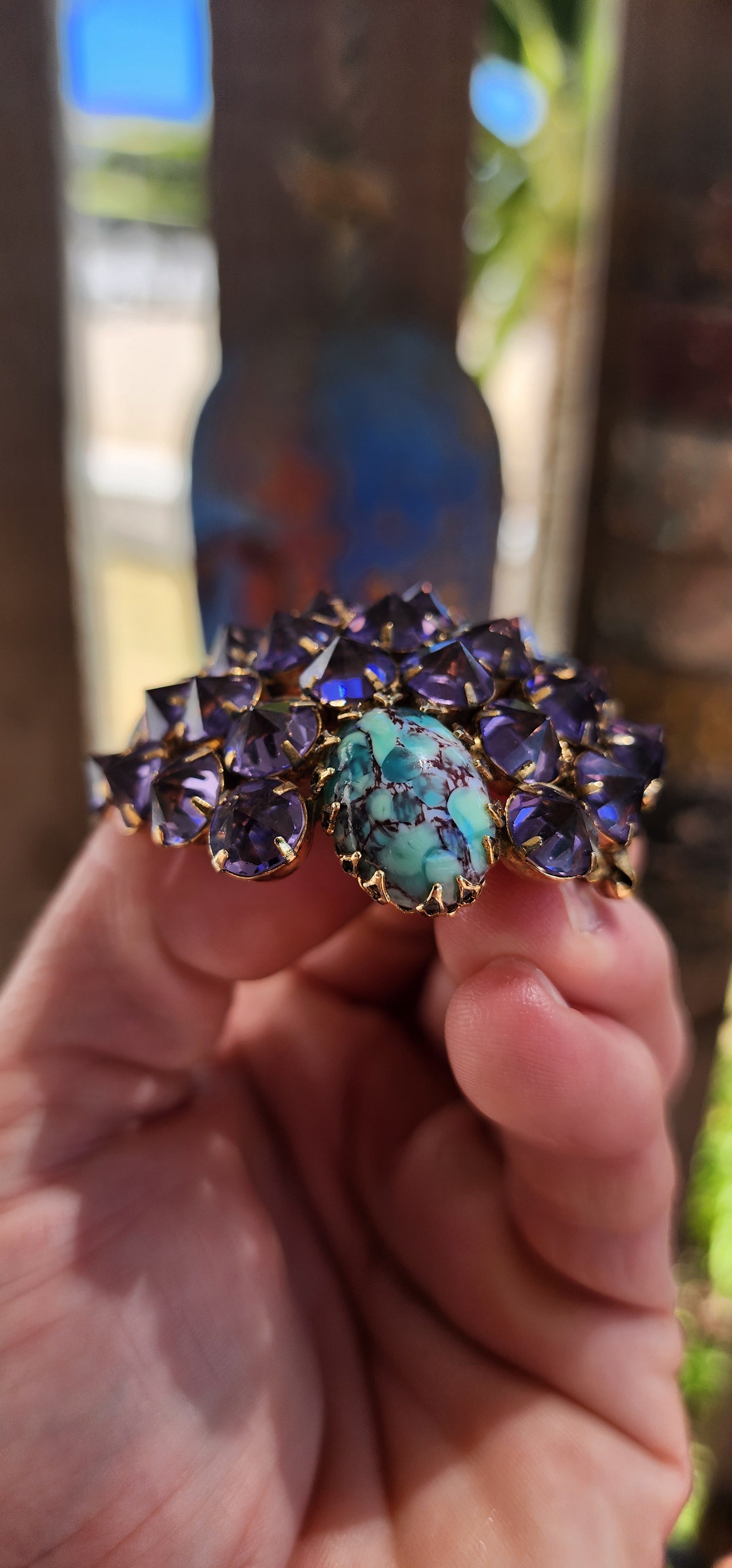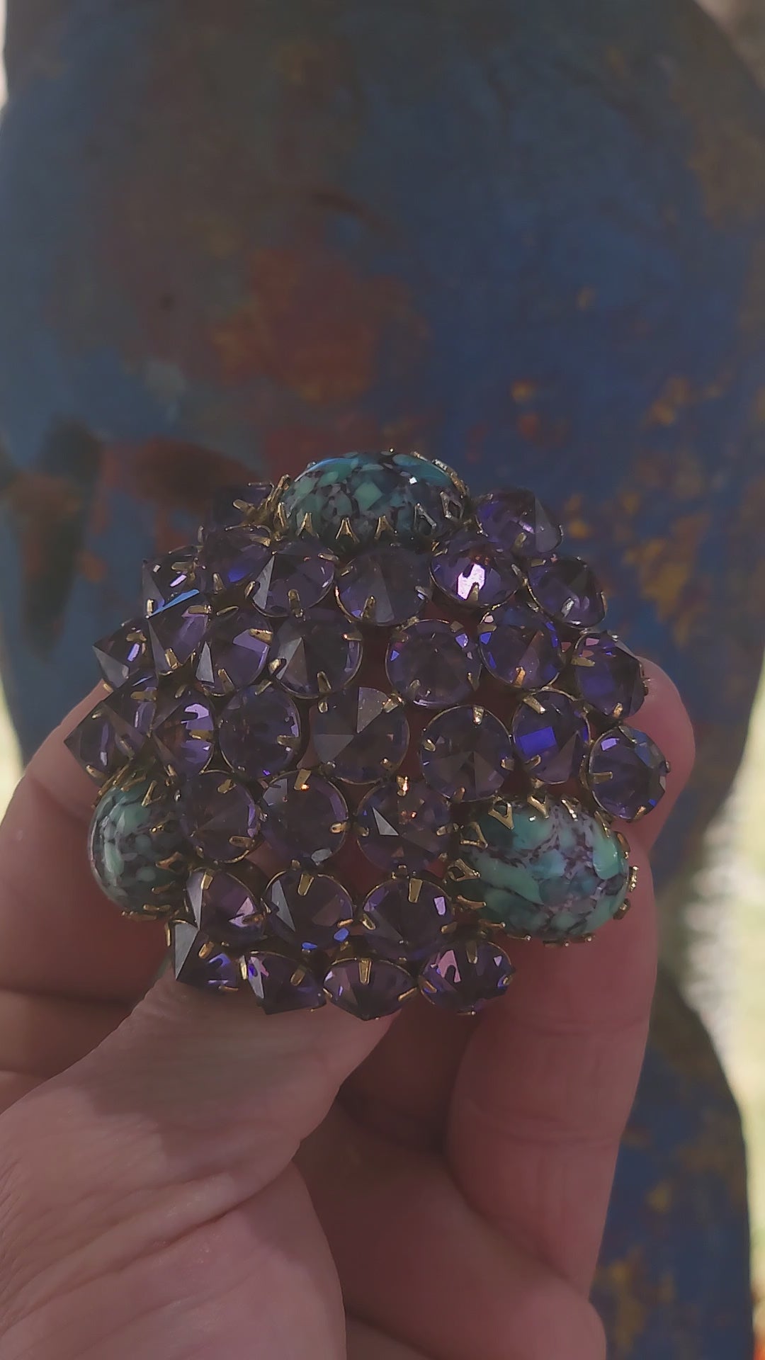 Up for grabs is an exceptionally rare and very large vintage 1950s designer costume brooch by none other than the iconic Schreiner of New York — proudly signed on the reverse. Schreiner pieces are the holy grail of mid-century costume jewellery, and this treasure is one of the most breathtaking examples you will encounter.