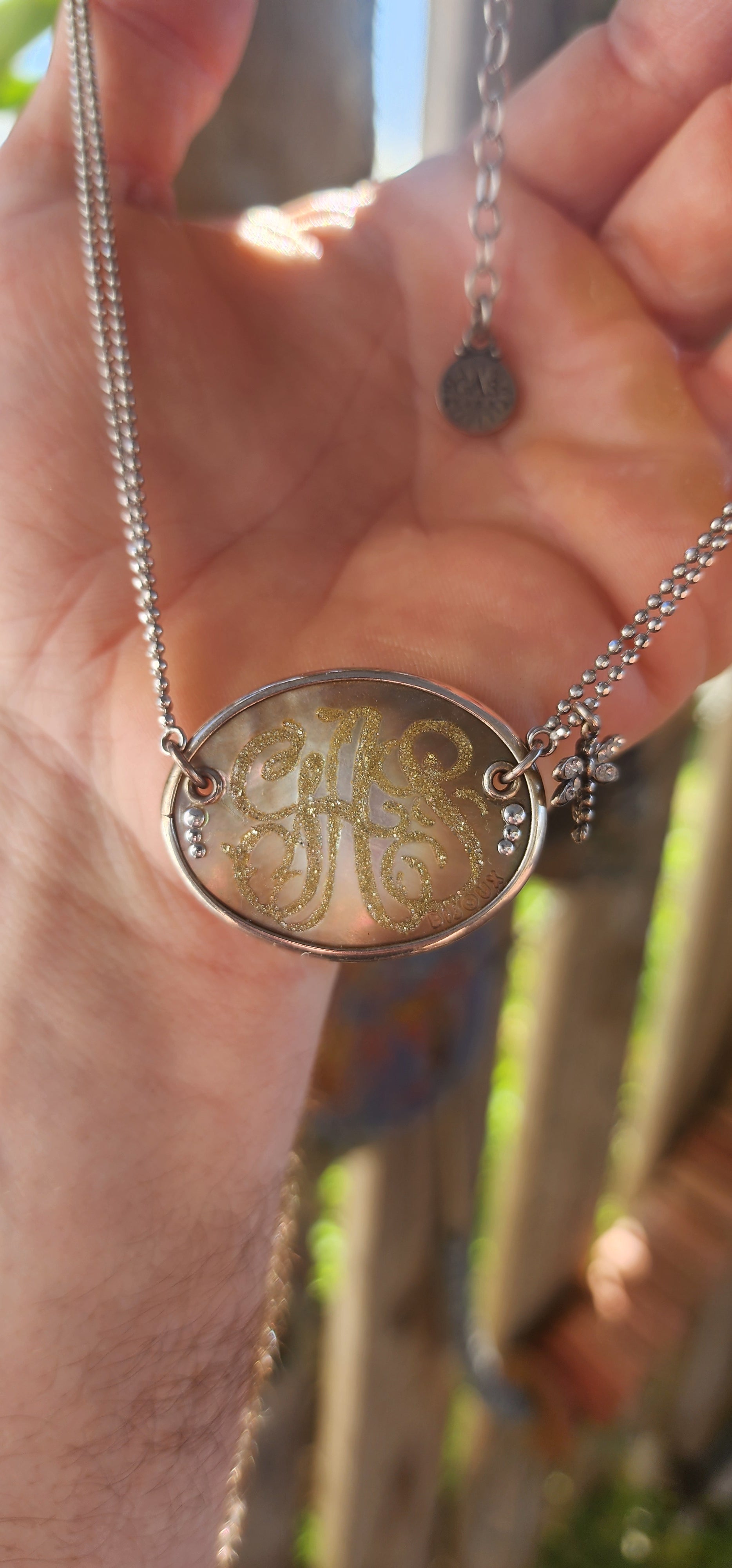 At its heart rests a double-sided oval mother-of-pearl panel pendant, set in a sleek tube bezel. One side features the shimmering “GAS” monogram written in elegant gold glitter calligraphy, while the reverse displays the engraved “Gas Bijoux” signature—etched directly into the iridescent nacre for a luminous effect. A delightful dragonfly charm dangles playfully beside the pendant, a hallmark symbol of freedom and lightness that reflects the brand’s bohemian soul
