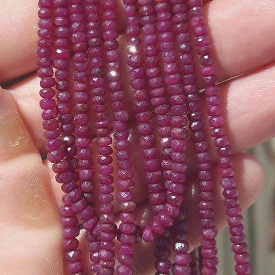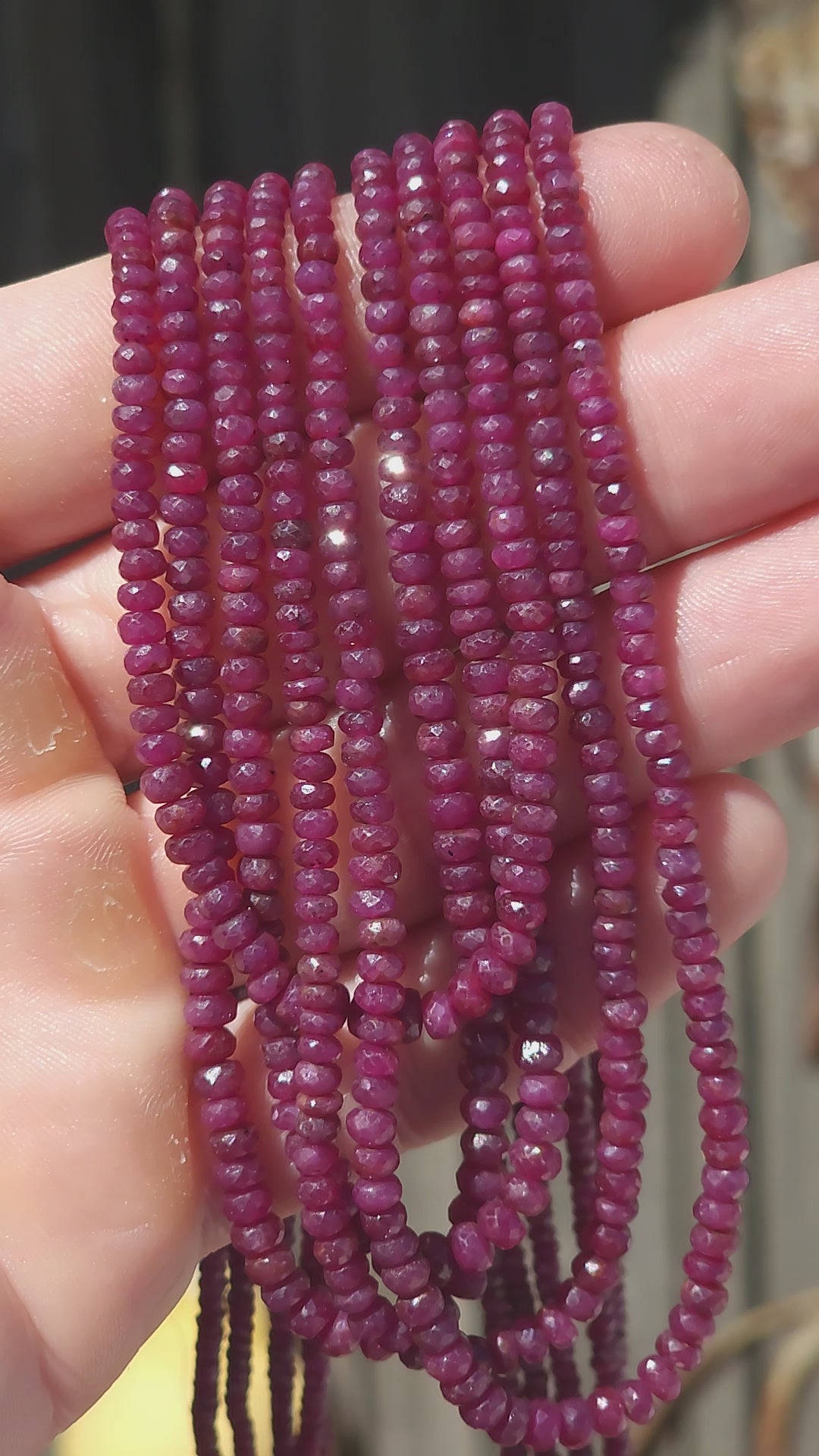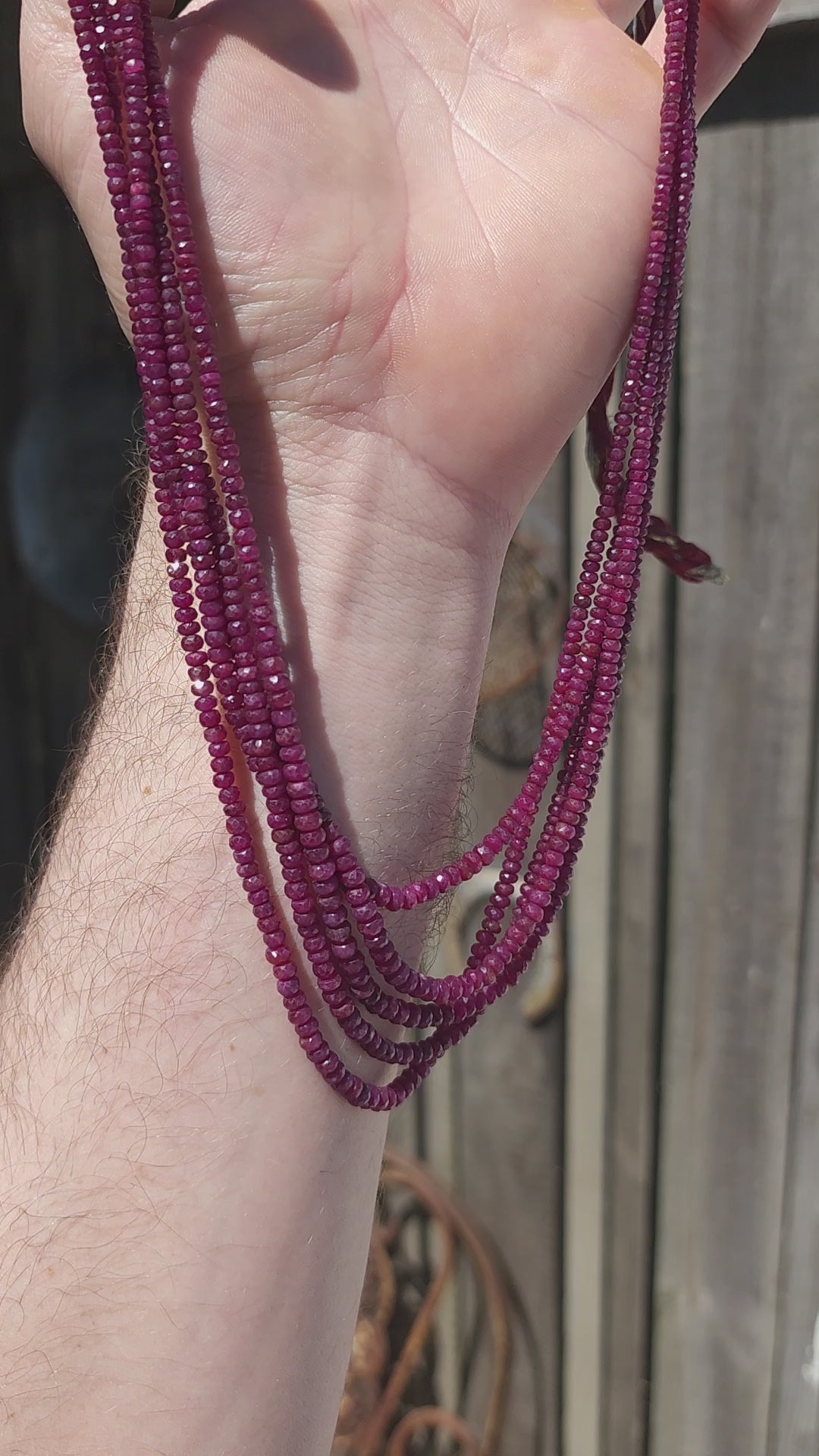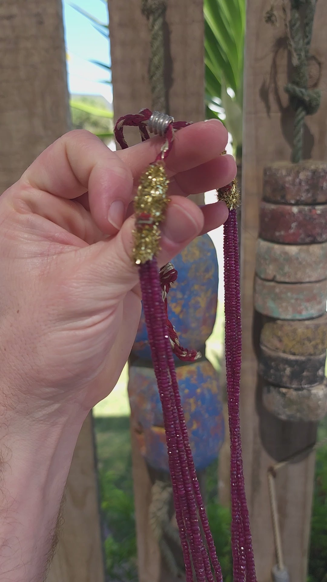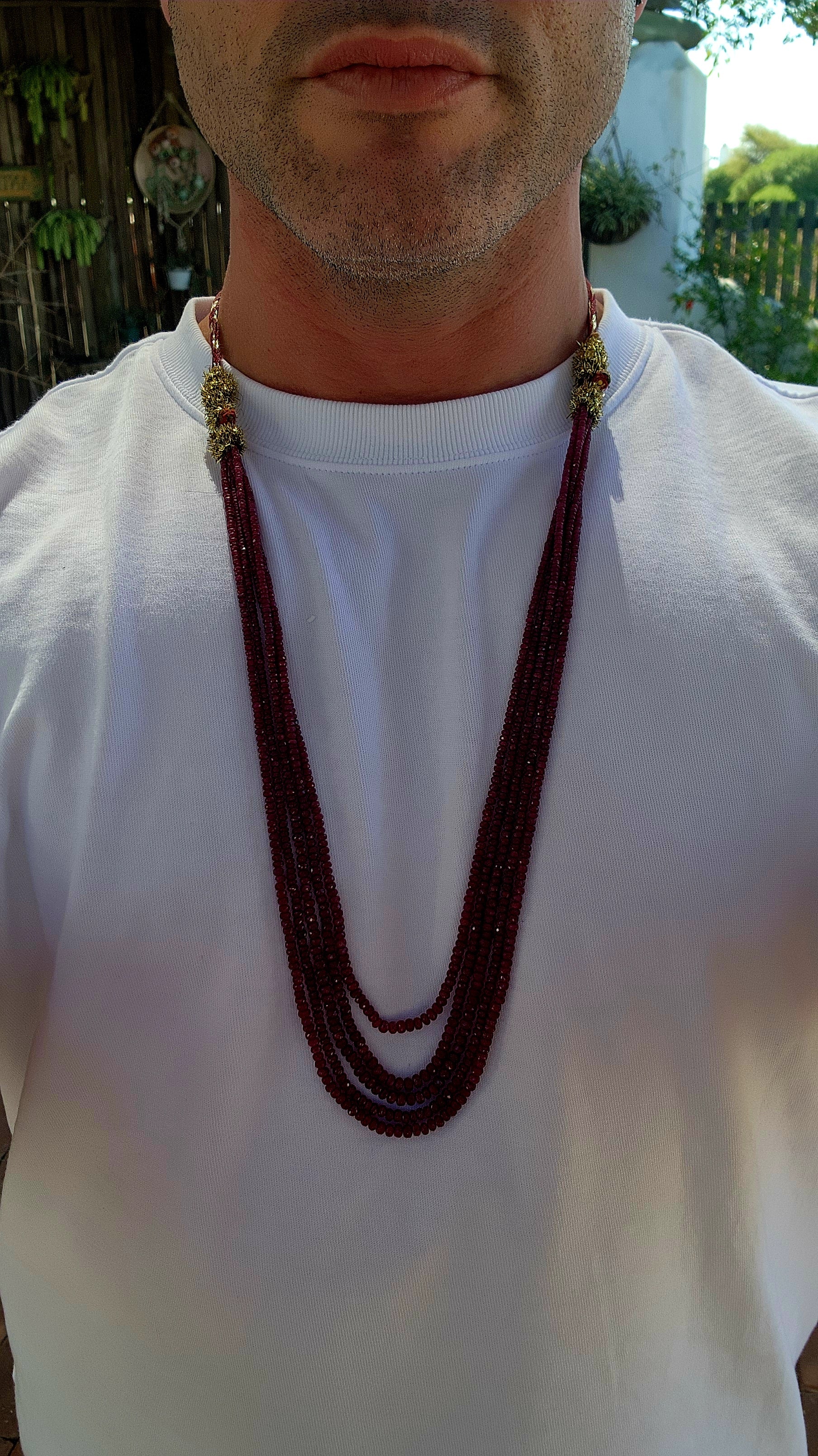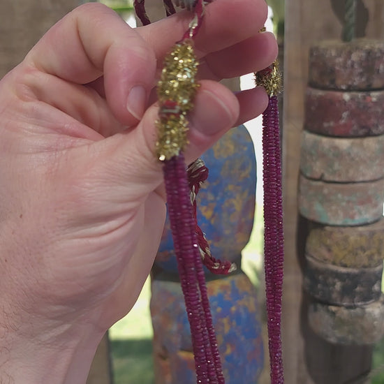 Each strand is intricately strung with natural ruby rondelle beads, beautifully hand-cut and faceted to catch and reflect light from every angle. The beads gracefully graduate in size, from larger near the base to smaller toward the neckline — creating a natural drape and rhythm that moves with you. The strands are finished with a traditional Indian handwoven red-and-gold silk cord and gold-threaded tassels, complete with an adjustable length toggle clasp for versatile styling.