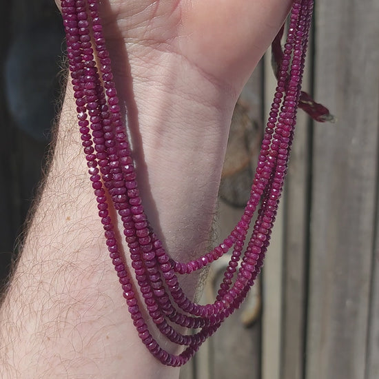 Ruby is the birthstone for July, representing love, vitality, and strength of heart. In gemstone lore, rubies are said to ignite passion, inspire confidence, and attract success. Wearing rubies close to the heart — as in this regal multi-strand necklace — is believed to enhance life force and energy, protecting the wearer from negativity.