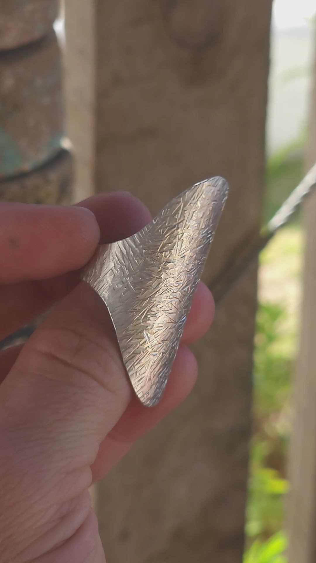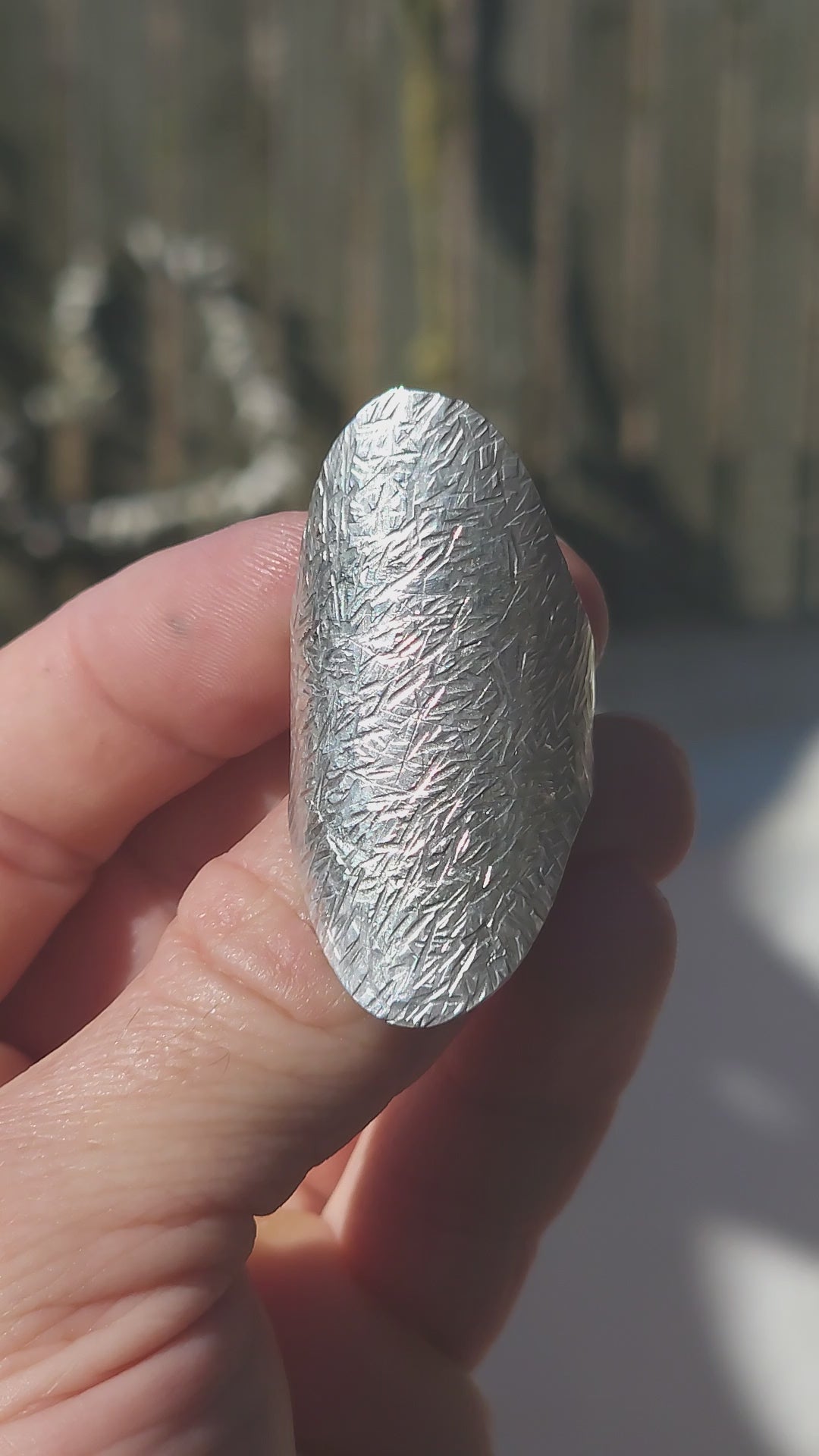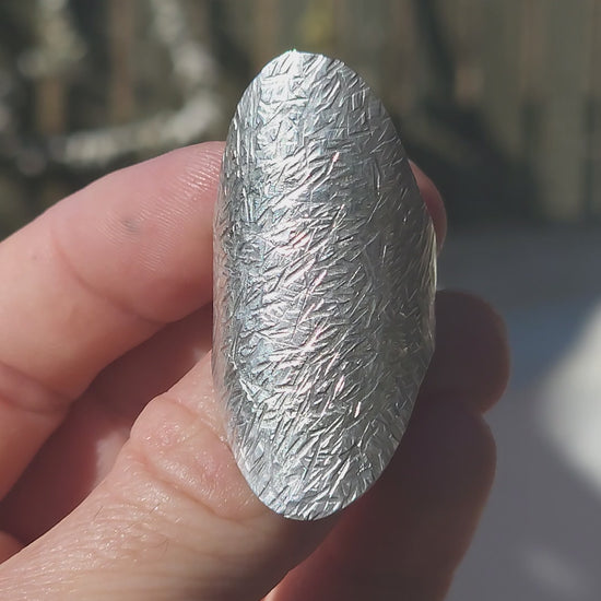 The front features a dramatically domed oval panel that hugs the finger like a piece of wearable armor. Its elongated shape instantly lengthens the look of the hand, creating that effortlessly cool, editorial silhouette. Every surface has been meticulously hand-textured and hammered, resulting in a rich, tactile finish that catches the light in a thousand tiny flashes. No two angles look the same — it’s alive with movement.