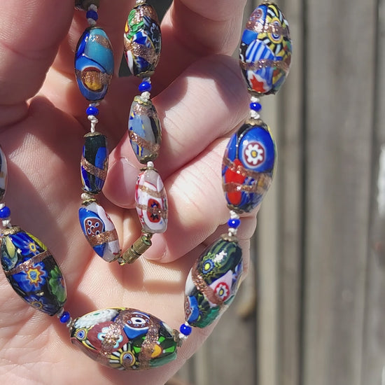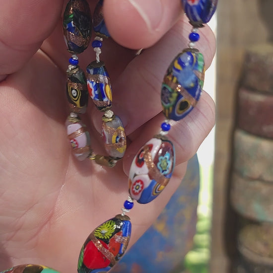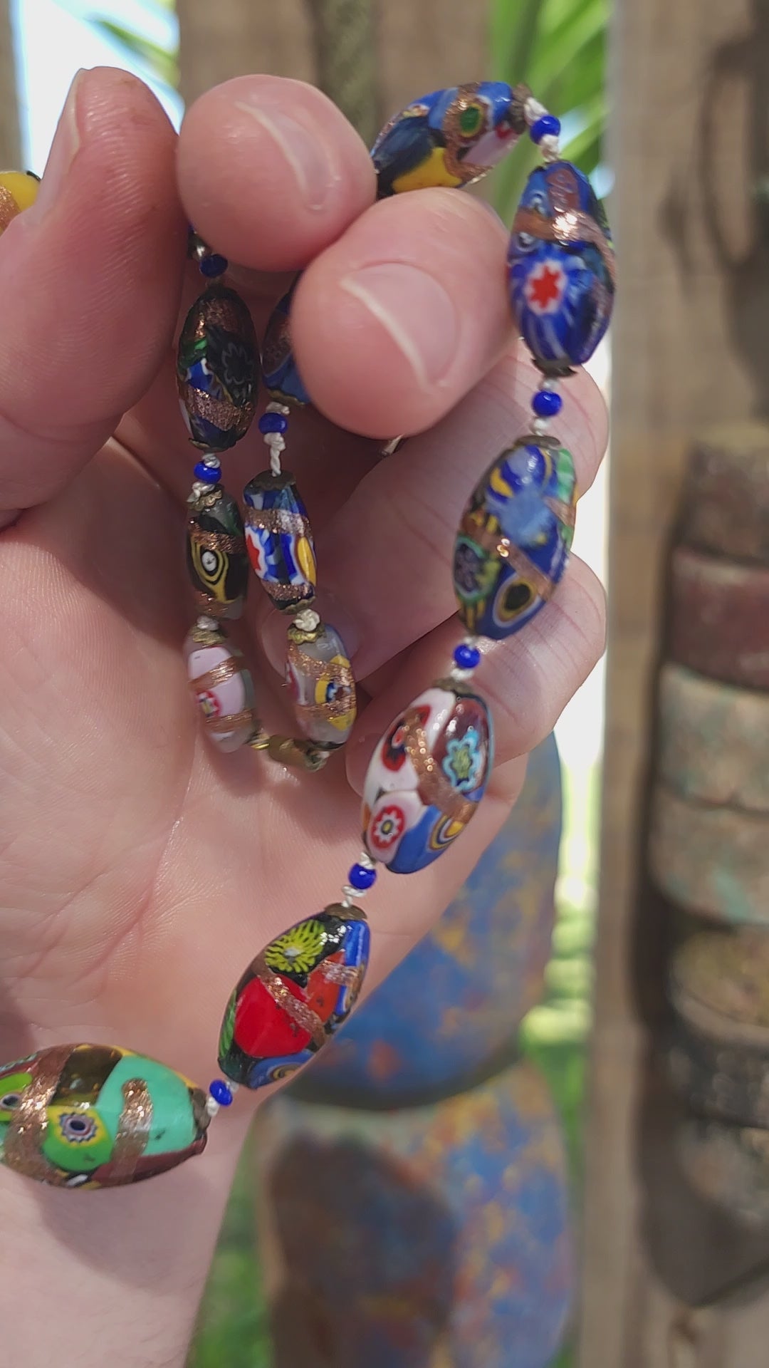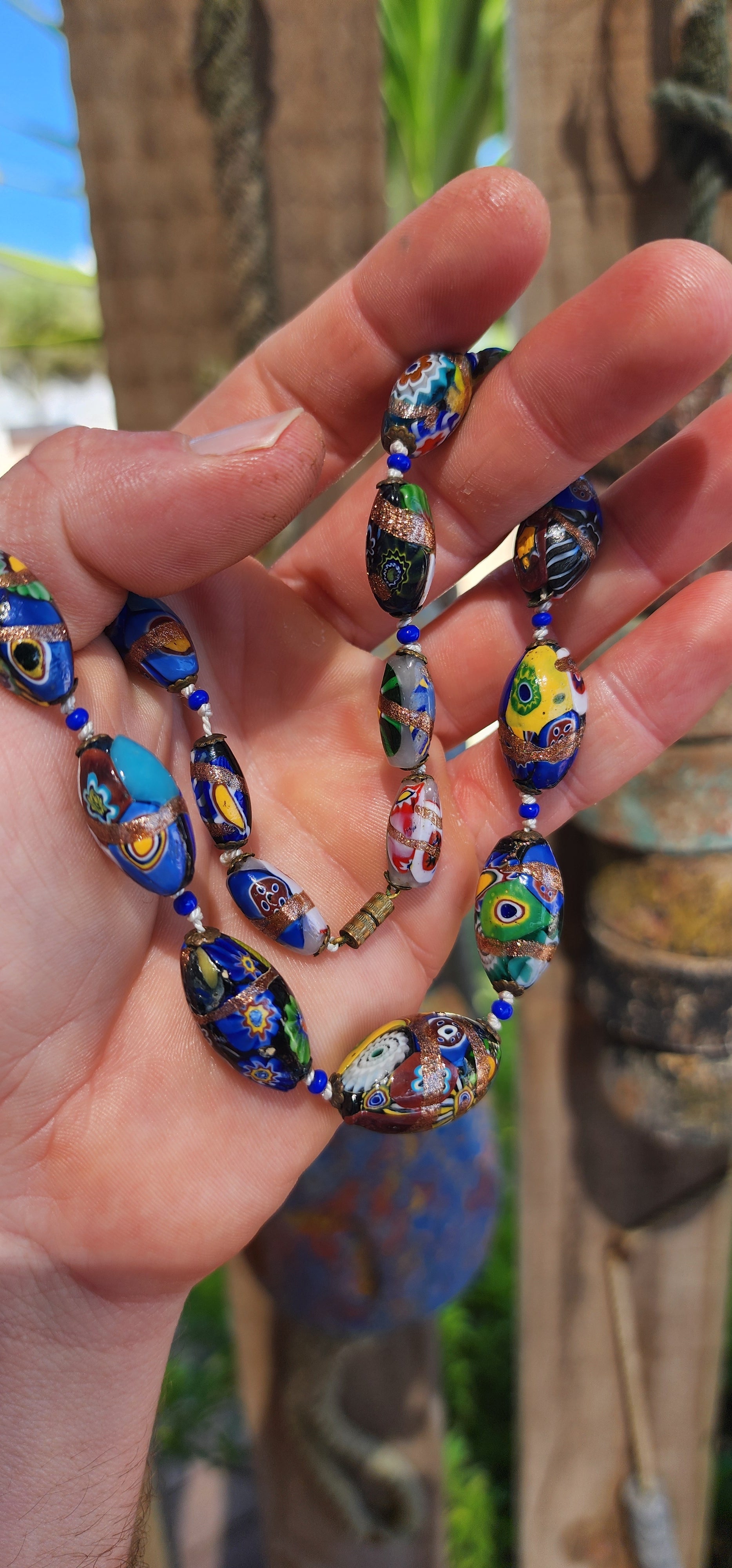 Each bead showcases the Millefiori technique (meaning “a thousand flowers”), where colorful glass canes are layered, fused, and sliced into intricate floral and geometric patterns before being encased in clear molten glass. What makes this necklace especially dazzling is the presence of copper aventurine inclusions — glittering metallic swirls that shimmer beneath the surface of the glass, catching the sunlight with a golden sparkle. This element, achieved by adding copper oxide to molten glass, is a hallmark of Murano’s finest work and adds a warm, luxurious glow to the bold blues, emerald greens, ruby reds, and sunlit yellows throughout the strand.