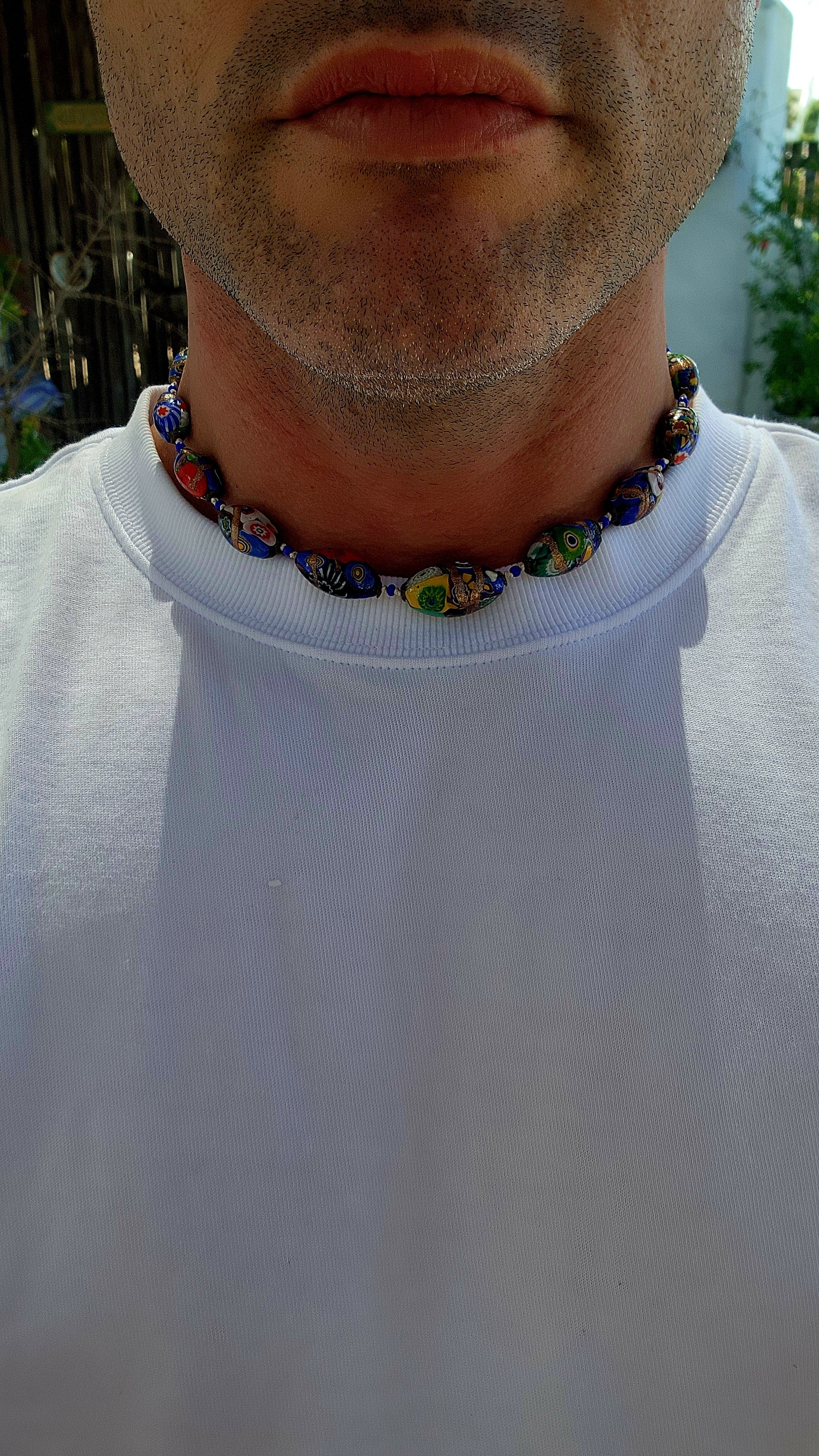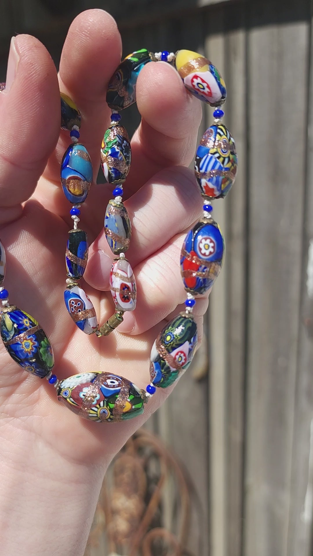 An extraordinary vintage art deco era Venetian Murano Millefiori glass choker necklace, bursting with color, craftsmanship, and old-world charm. This captivating piece features graduated oval-shaped glass beads, each one a tiny, hand-formed masterpiece created on the fabled island of Murano, Italy — the cradle of fine glass artistry for over 700 years.