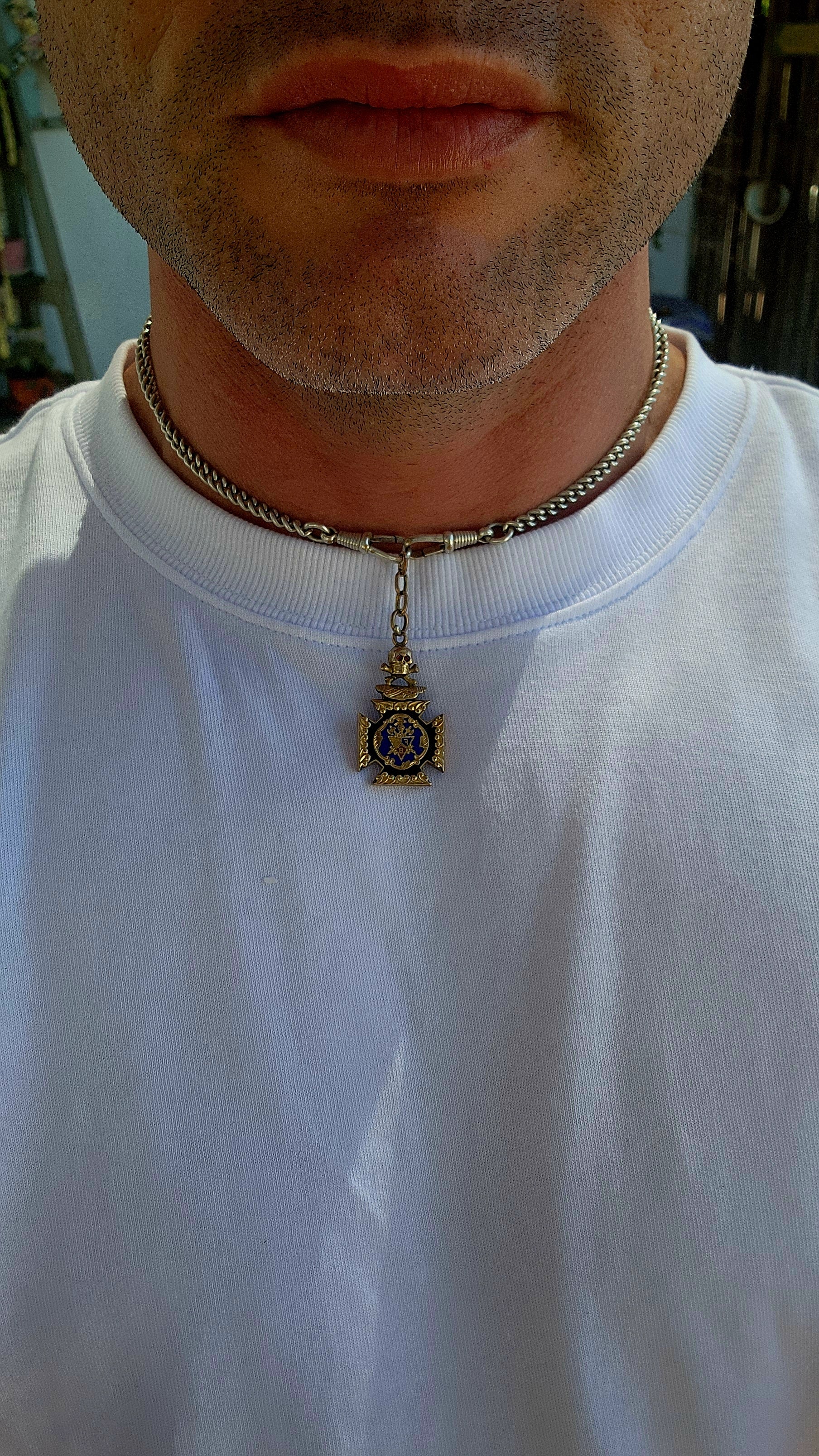 Atop the pendant sits an articulated skull and crossbones, a memento mori symbol reminding its wearer of mortality and the virtues of honor and brotherhood beyond the grave. The skull’s eyes are set with tiny red garnet cabochons, adding a haunting yet beautiful glint of realism.