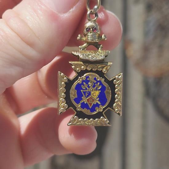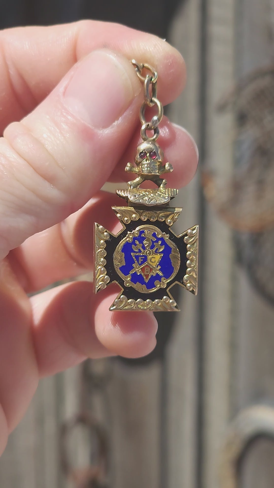 The pendant is masterfully shaped as a cross pattée, with finely chased gold borders and deep black enamel panels. At its center gleams the emblem of the Knights of Pythias — the crossed sword and knight’s helmet over a blue,yellow and red enamel triangle inscribed with the letters F – C – B, representing the fraternity’s sacred motto: Friendship, Charity, and Benevolence.