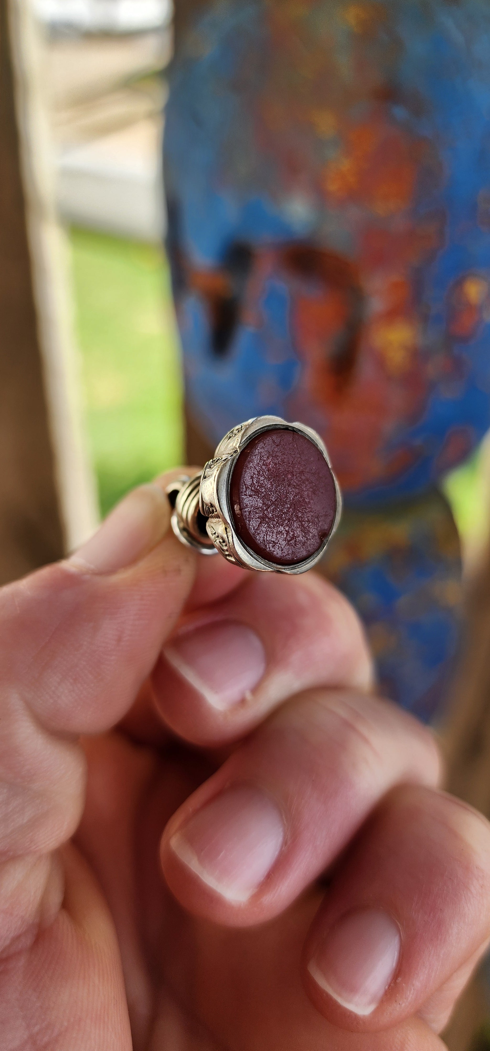 The base holds the pièce de résistance: a round carnelian cabochon, tube-set within a scalloped flower-shaped frame. Carnelian, with its deep russet warmth, was one of the most beloved gemstones of the 19th century — prized not only for its beauty but also for its associations with vitality, courage, and protection. Historically, carnelian seals were favored for intaglios and signets, as the stone’s fine grain made it ideal for carving detailed impressions in wax.