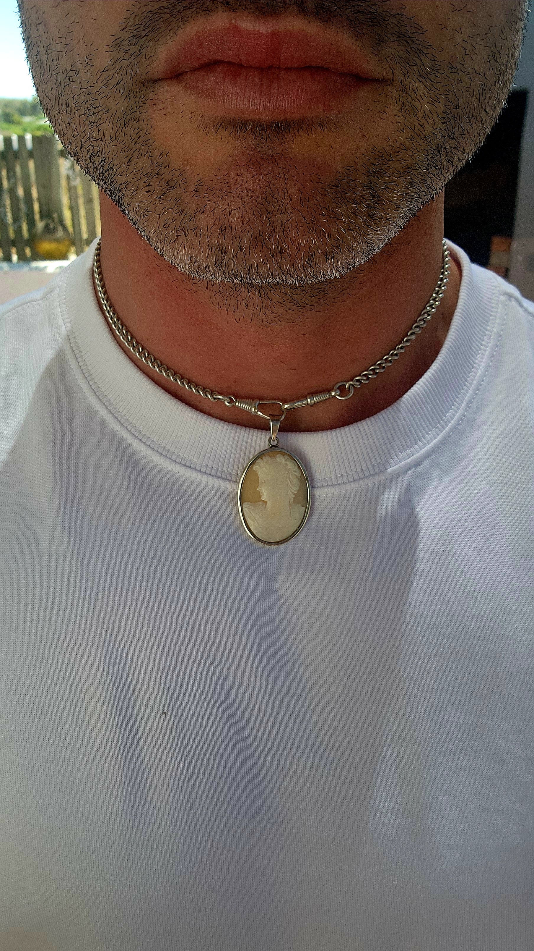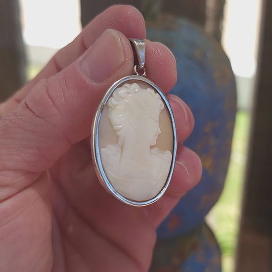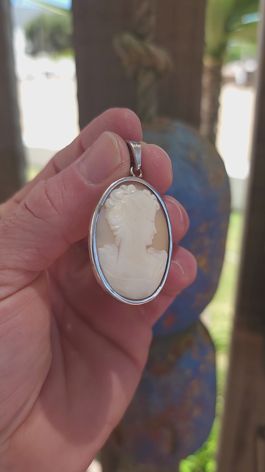 Up for grabs is this beautifull and generous in size vintage shell cameo pendant, lovingly set in a sleek sterling silver tube-style frame.