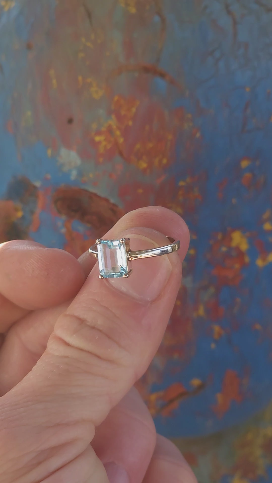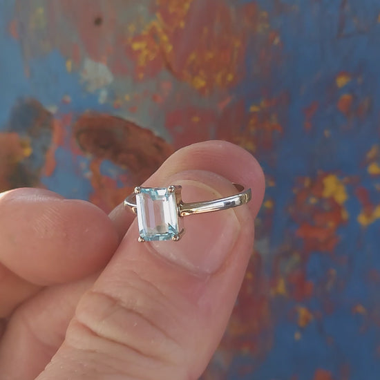 At its heart lies a captivating emerald-cut sky blue topaz, held securely in a four-prong raised basket setting that allows light to flow through the gem, enhancing its crystalline brilliance. The clean, polished shoulders taper gently into the gemstone, creating an elegant silhouette that’s both minimalist and refined.