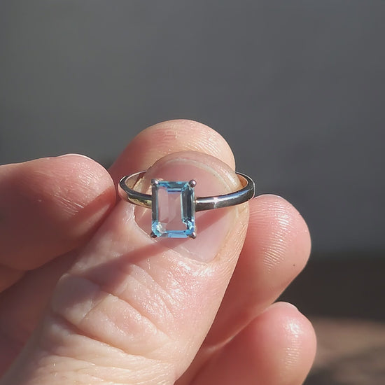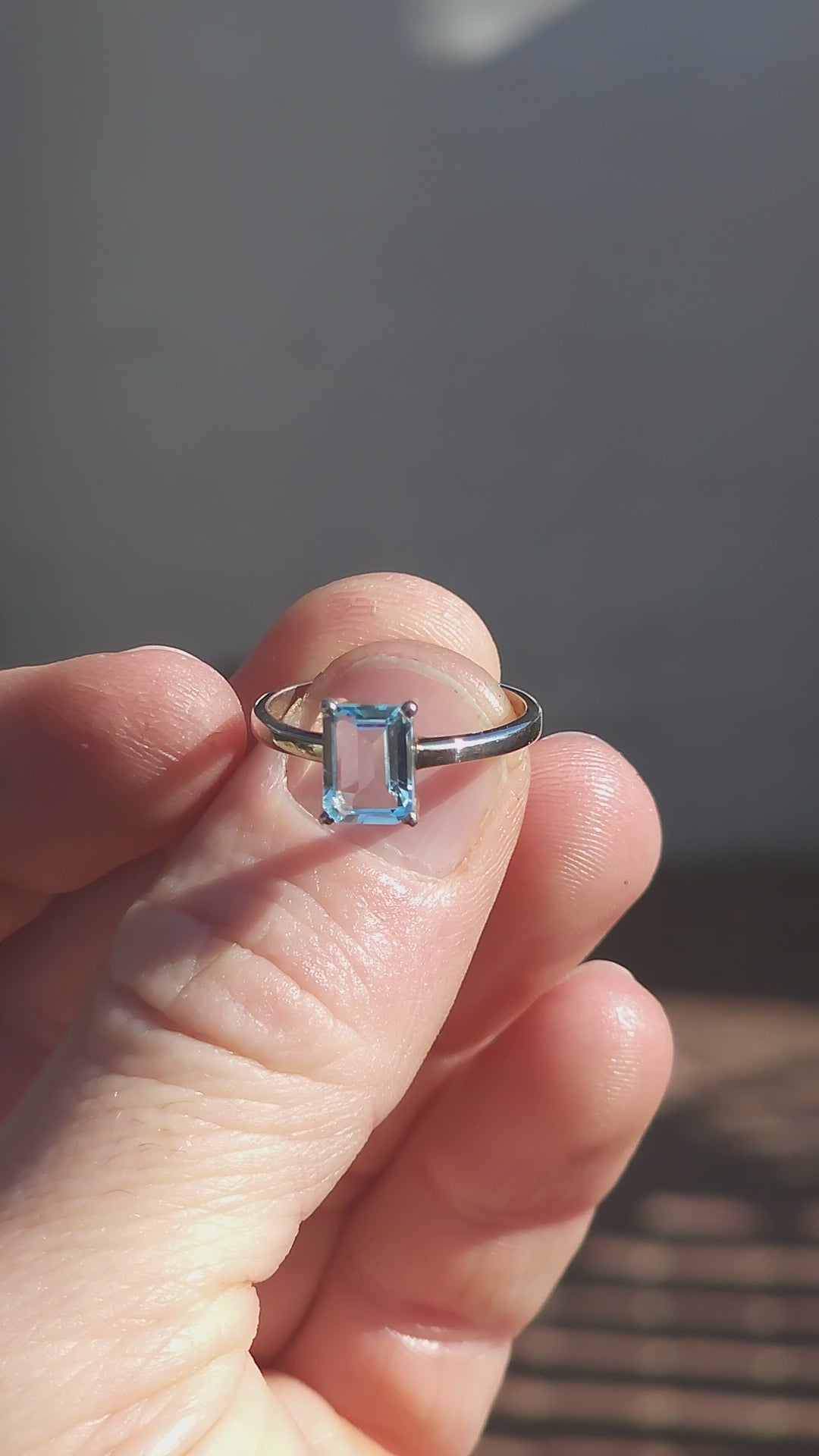 The emerald cut emphasizes the gem’s transparency and clarity, producing a serene, almost water-like glow when it catches the light. The cool hue of the sky blue topaz—a delicate, airy blue reminiscent of a clear summer sky—contrasts beautifully with the mirror-finished sterling silver band.