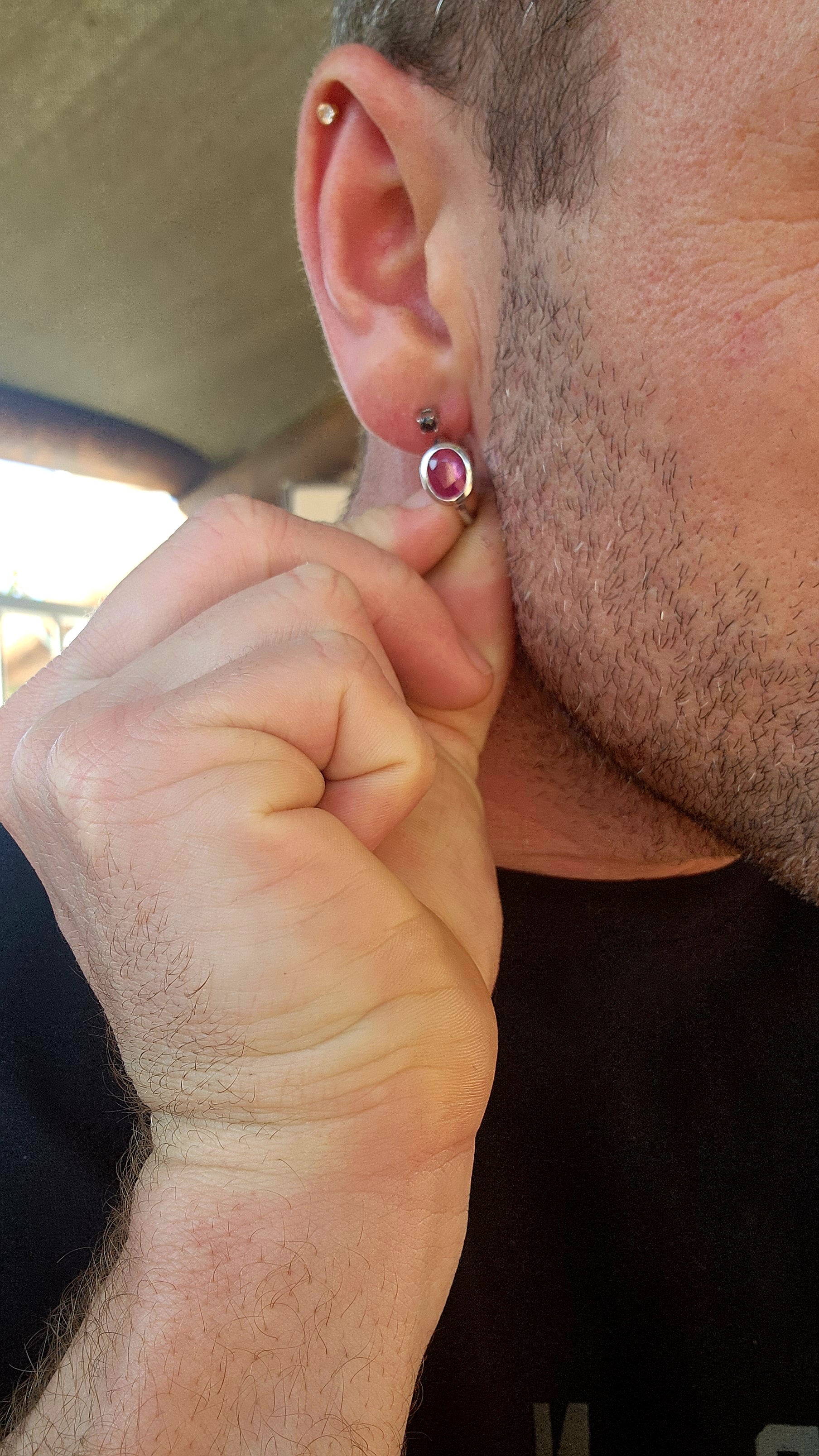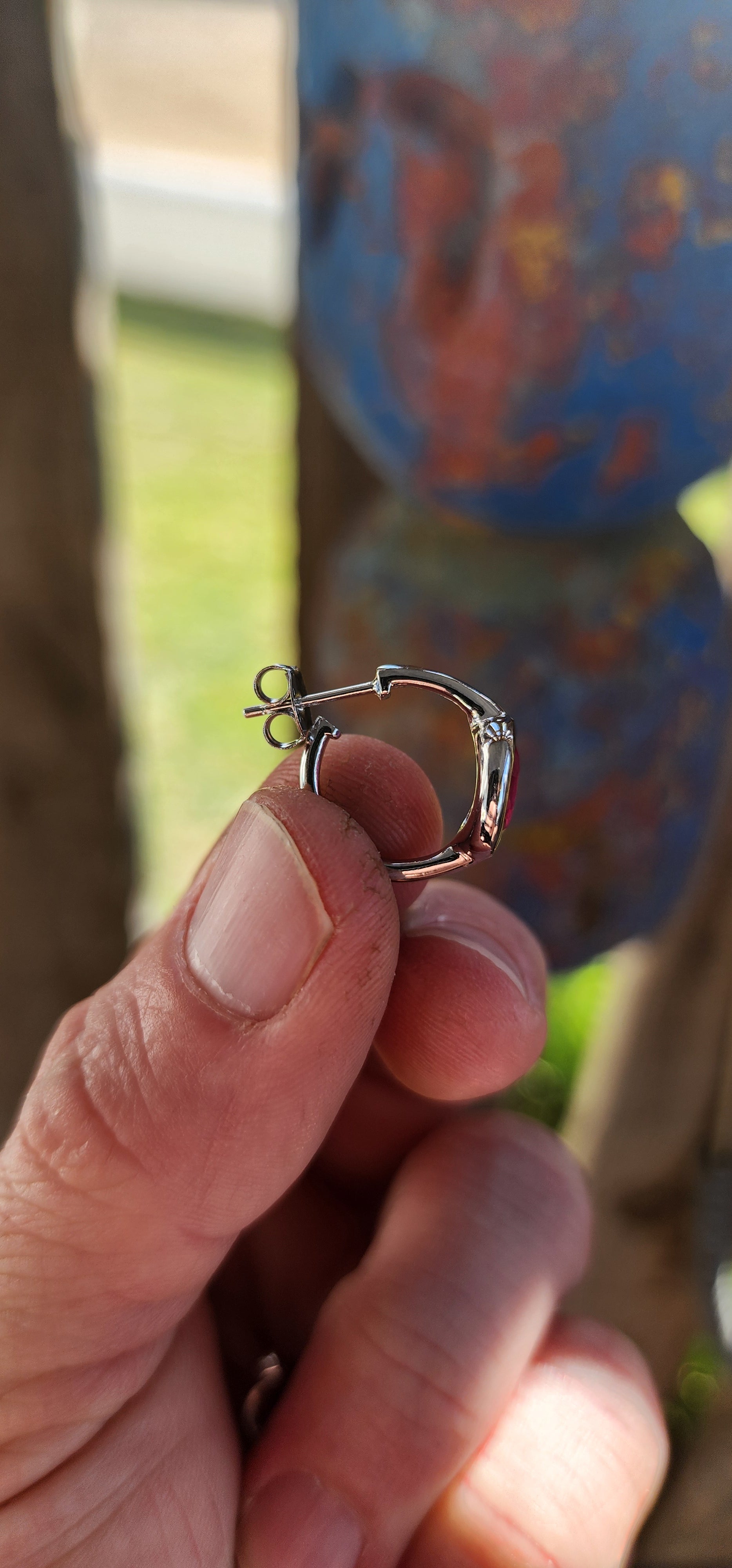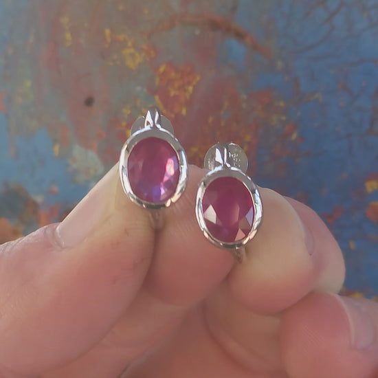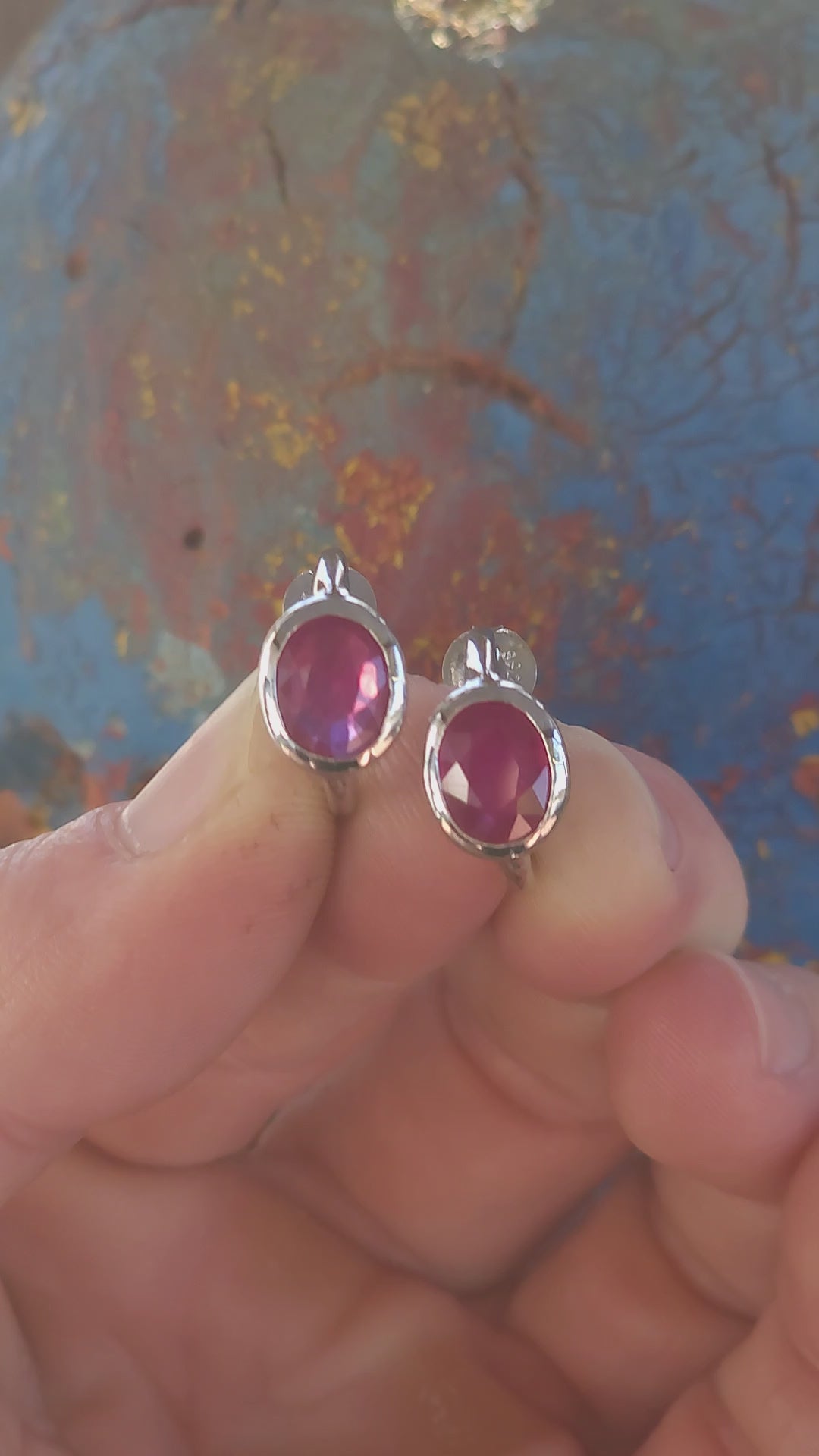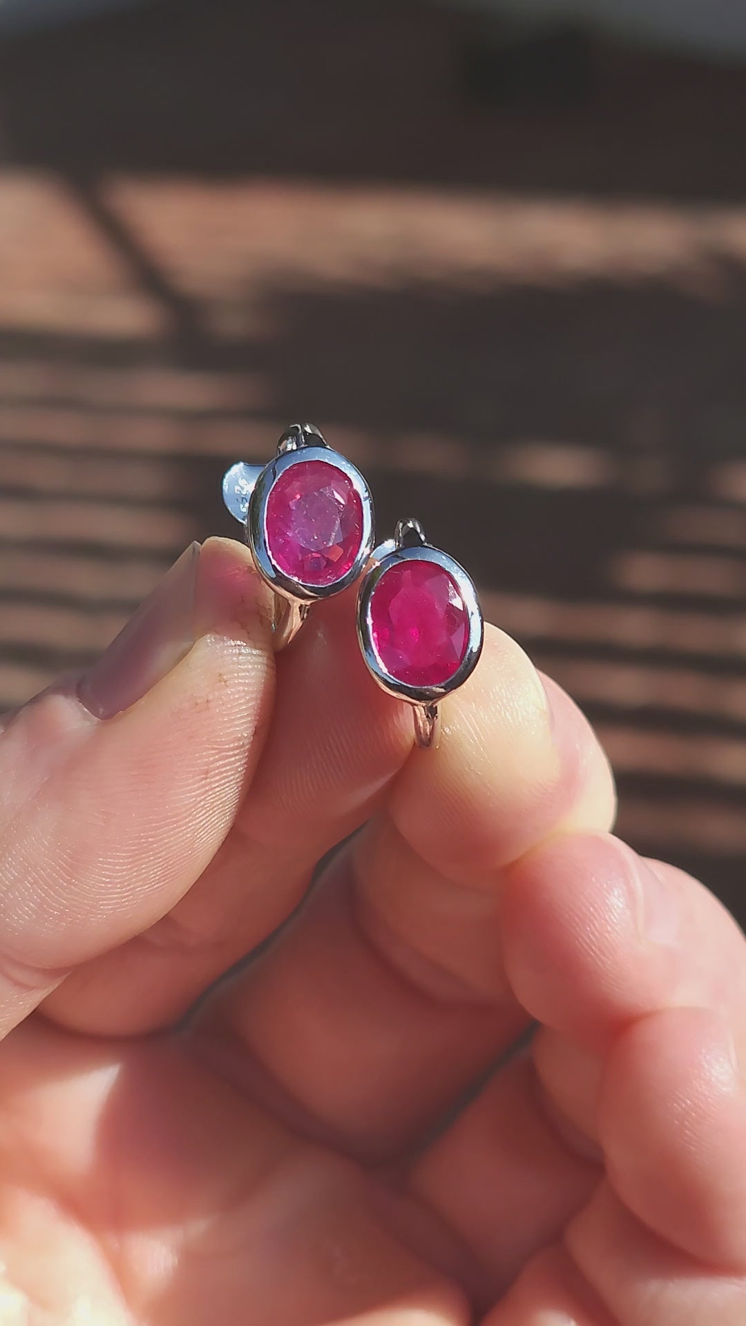 Bold, elegant, and effortlessly refined — this modernist pair of sterling silver half-hoop stud earrings commands attention with their minimalist geometry and rich color. Each earring showcases a vibrant oval-cut ruby, expertly tube-set in a smooth bezel mount at the center of the gently curved silver hoop. The design offers a seamless transition between contemporary and classic, balancing sleek metallic shine with the fiery glow of the gemstone.