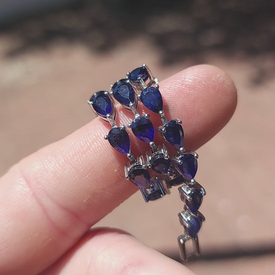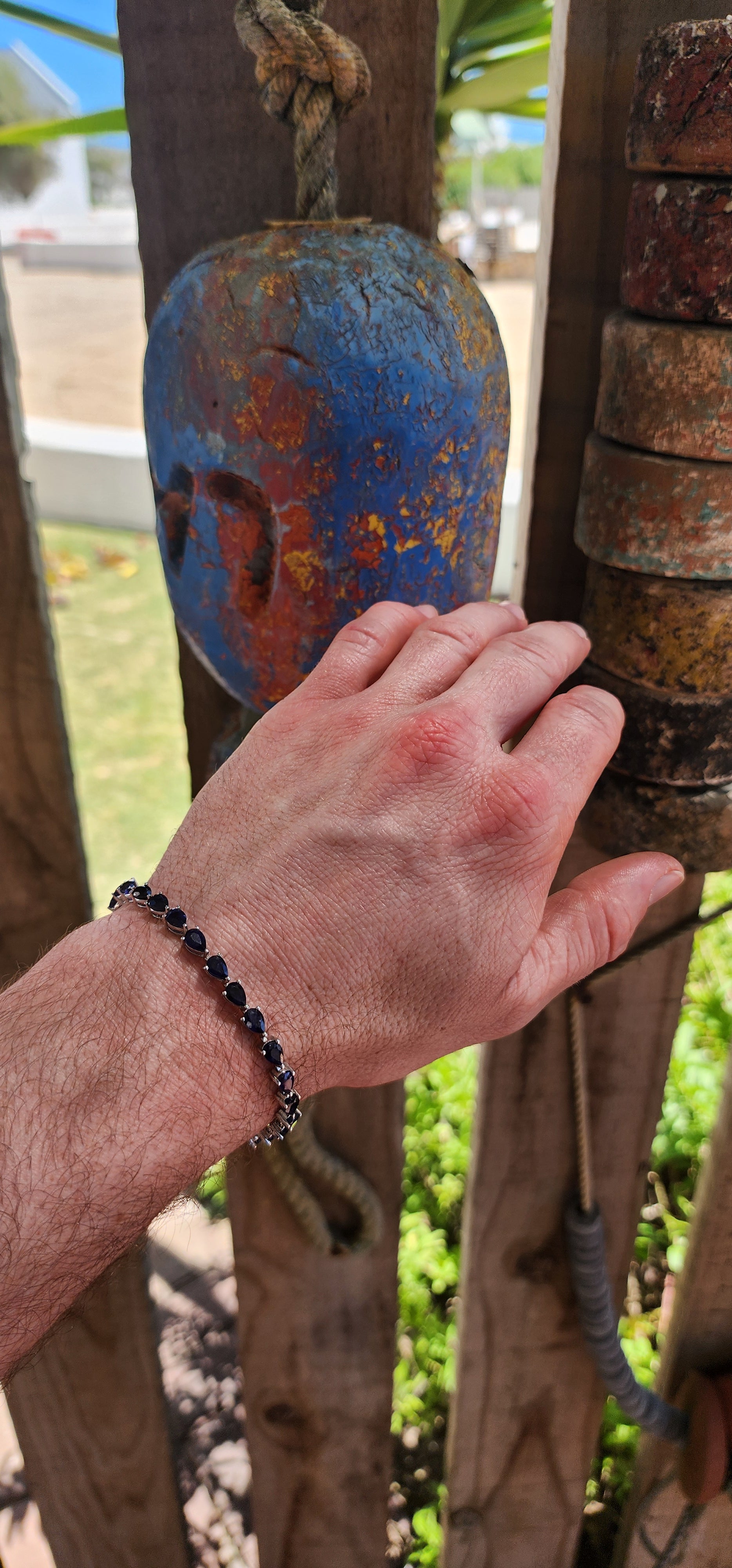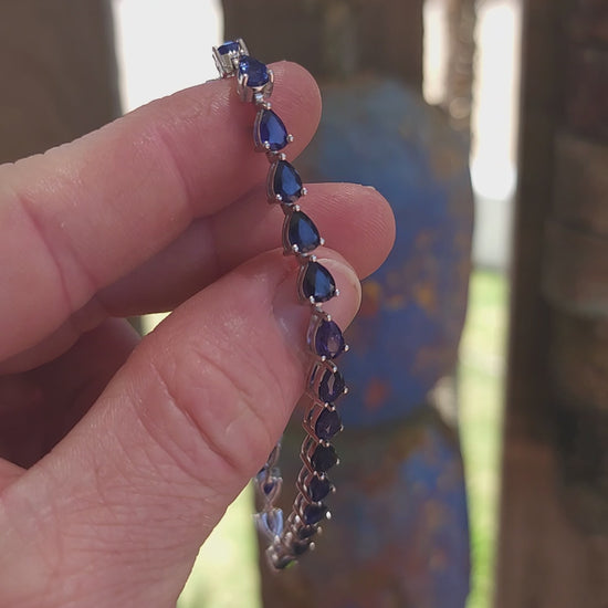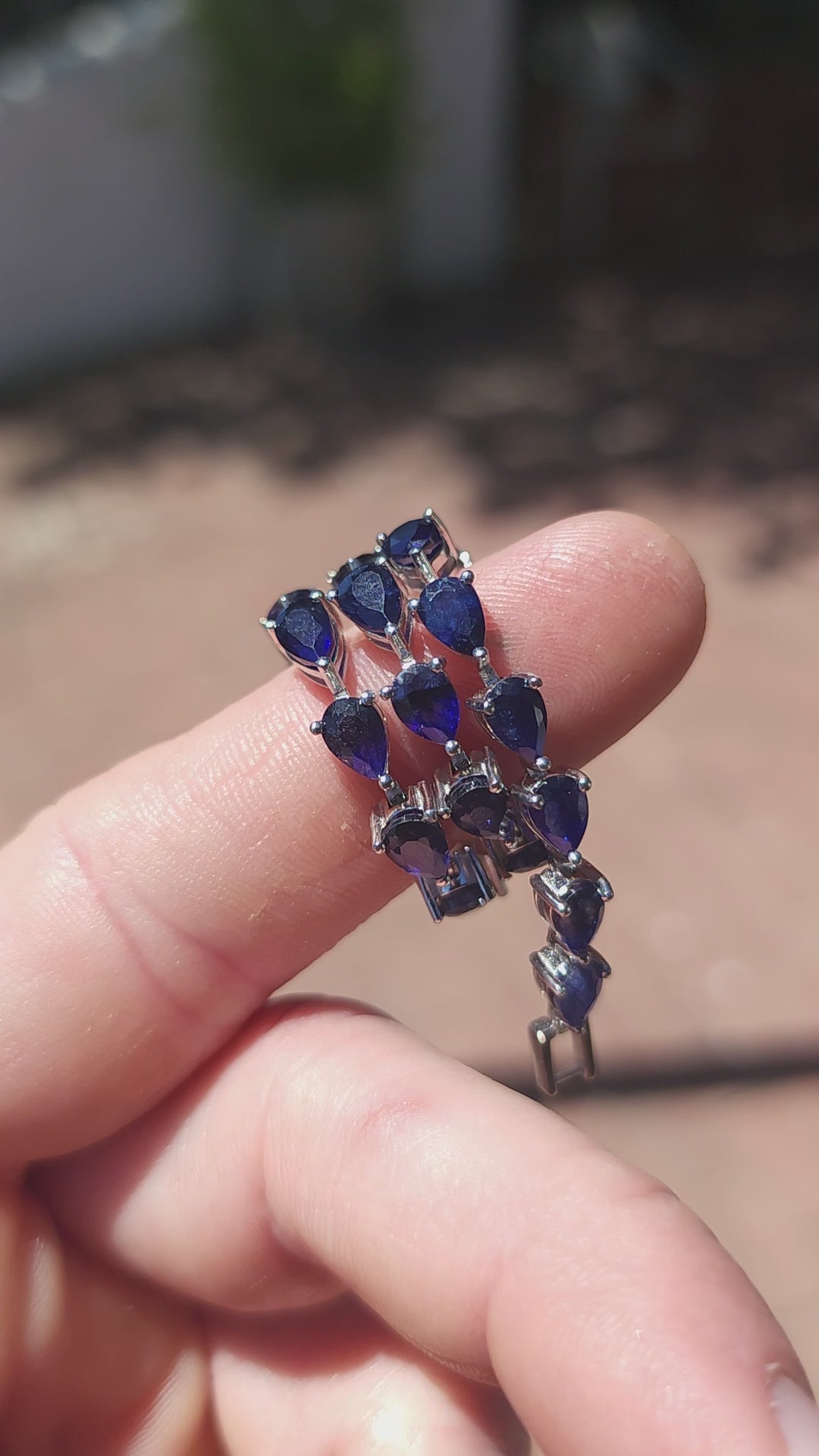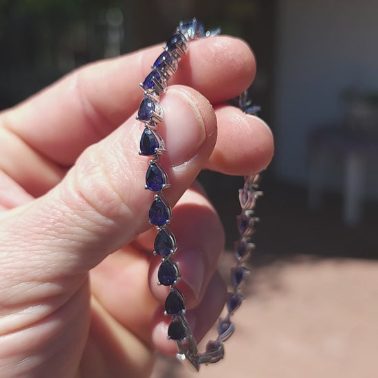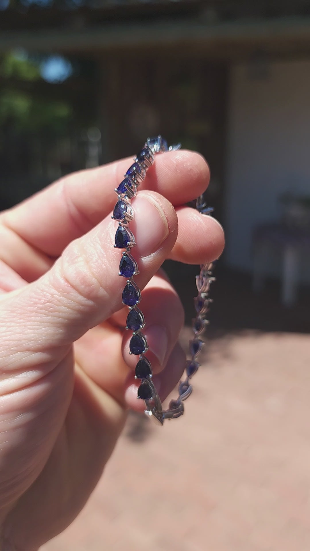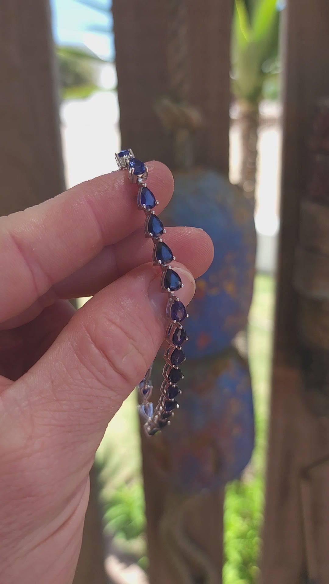 Breathtakingly beautiful sterling silver tennis bracelet, shimmering with 25 pear-cut deep-blue sapphires.