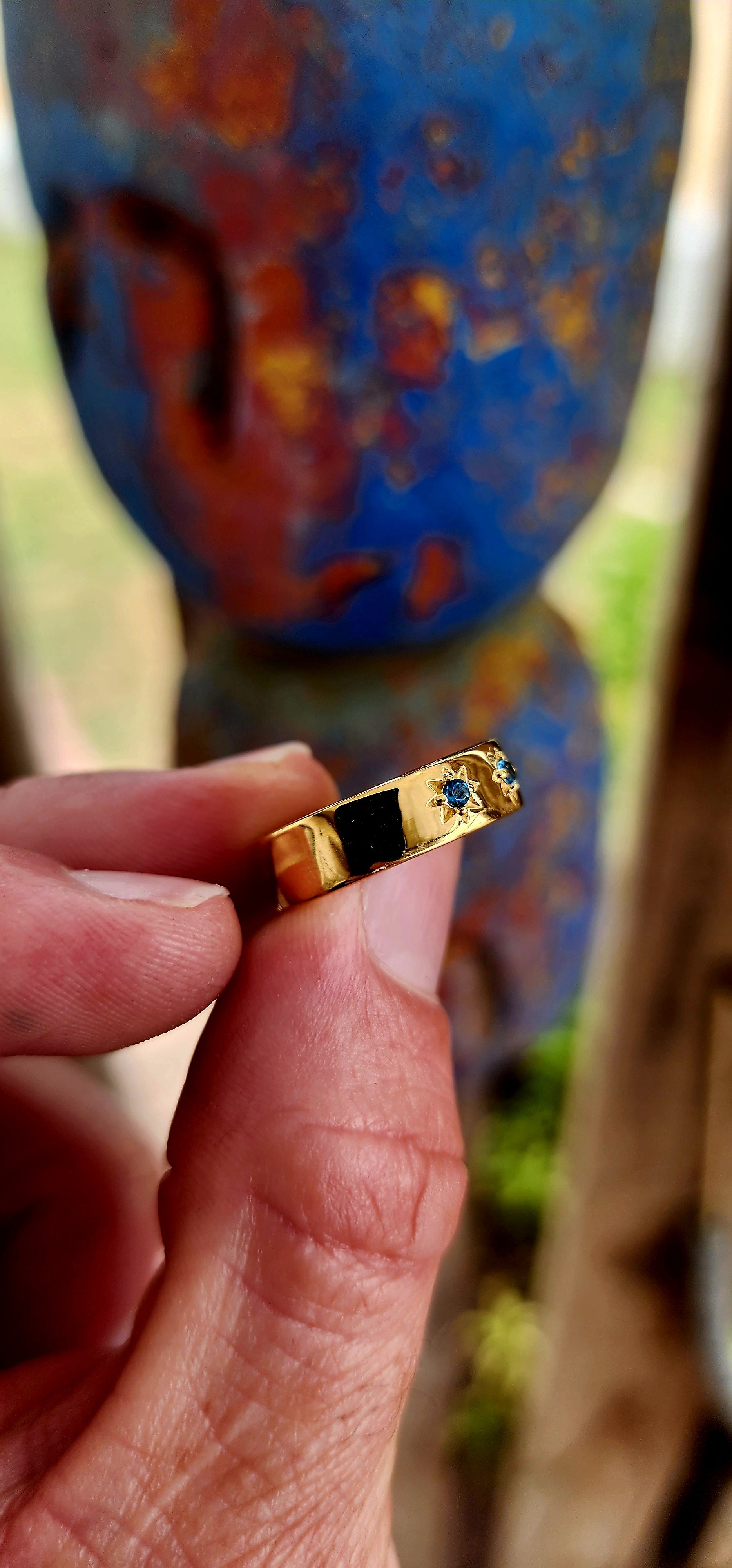 Measurements : The ring measures as a size Q as per ring measure stick and 6mm wide.Each of the topaz gemstones measure approx 2mm in diameter.The ring with a weight of 4.2 grams.