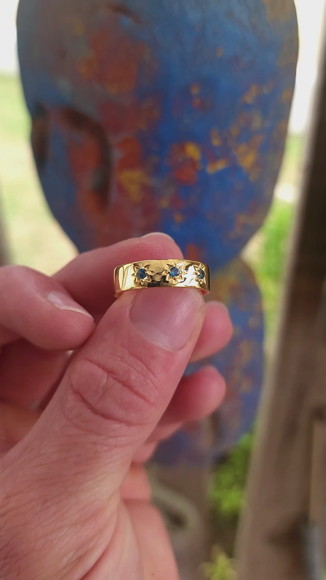 Set across the front are three round-cut London Blue Topaz gemstones, each raised proudly within hand-engraved starburst settings. The engraving radiates around each topaz like celestial flares, giving that timeless vintage gypsy-band charm with a cosmic, sovereign edge.