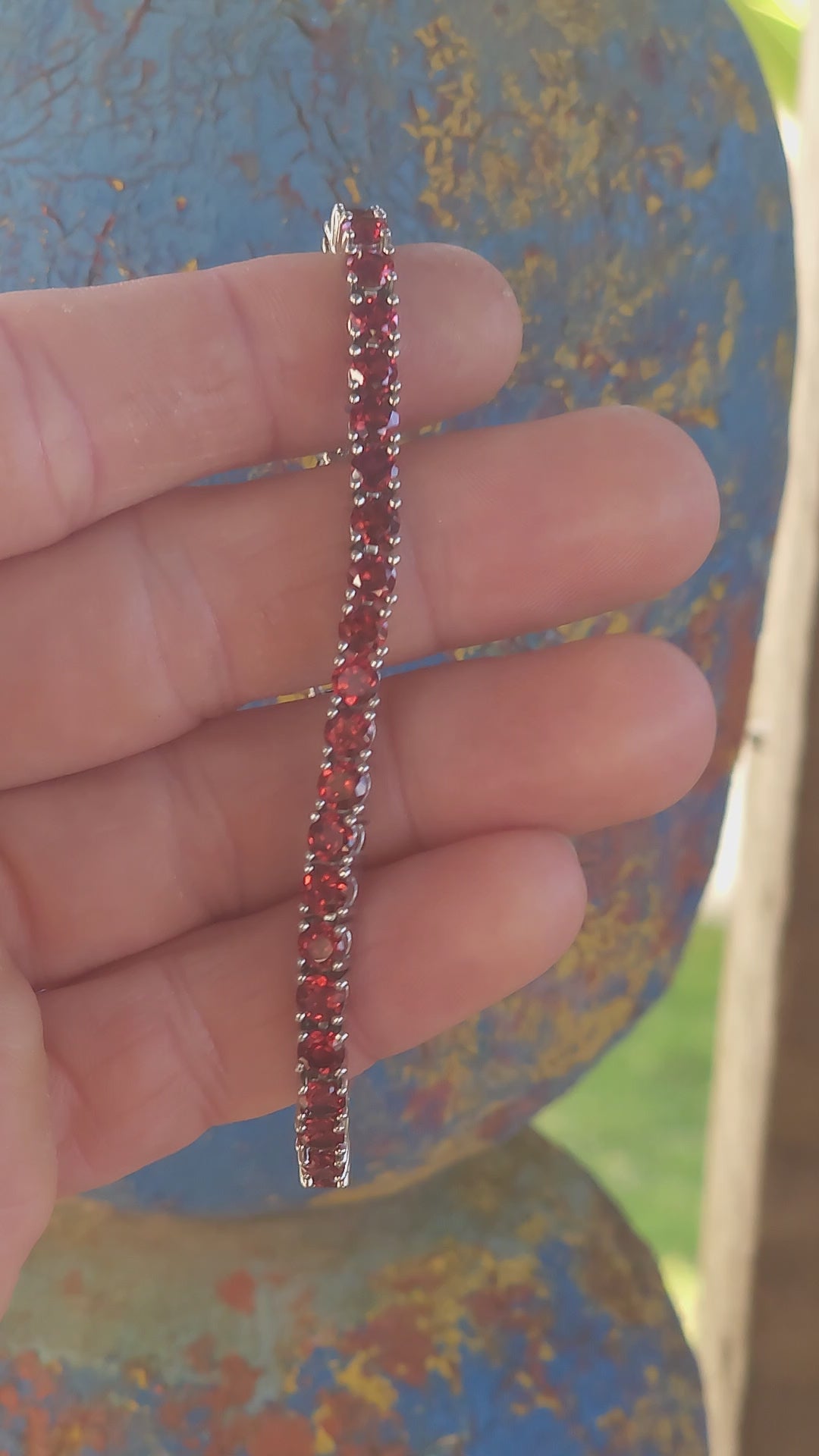 This captivating tennis bracelet is crafted from polished sterling silver, designed with elegance that suits both men and women. The bracelet showcases a continuous line of 37 round-cut, four-prong set natural garnets, each gleaming with deep pomegranate-red hues — a color long associated with passion, strength, and vitality.