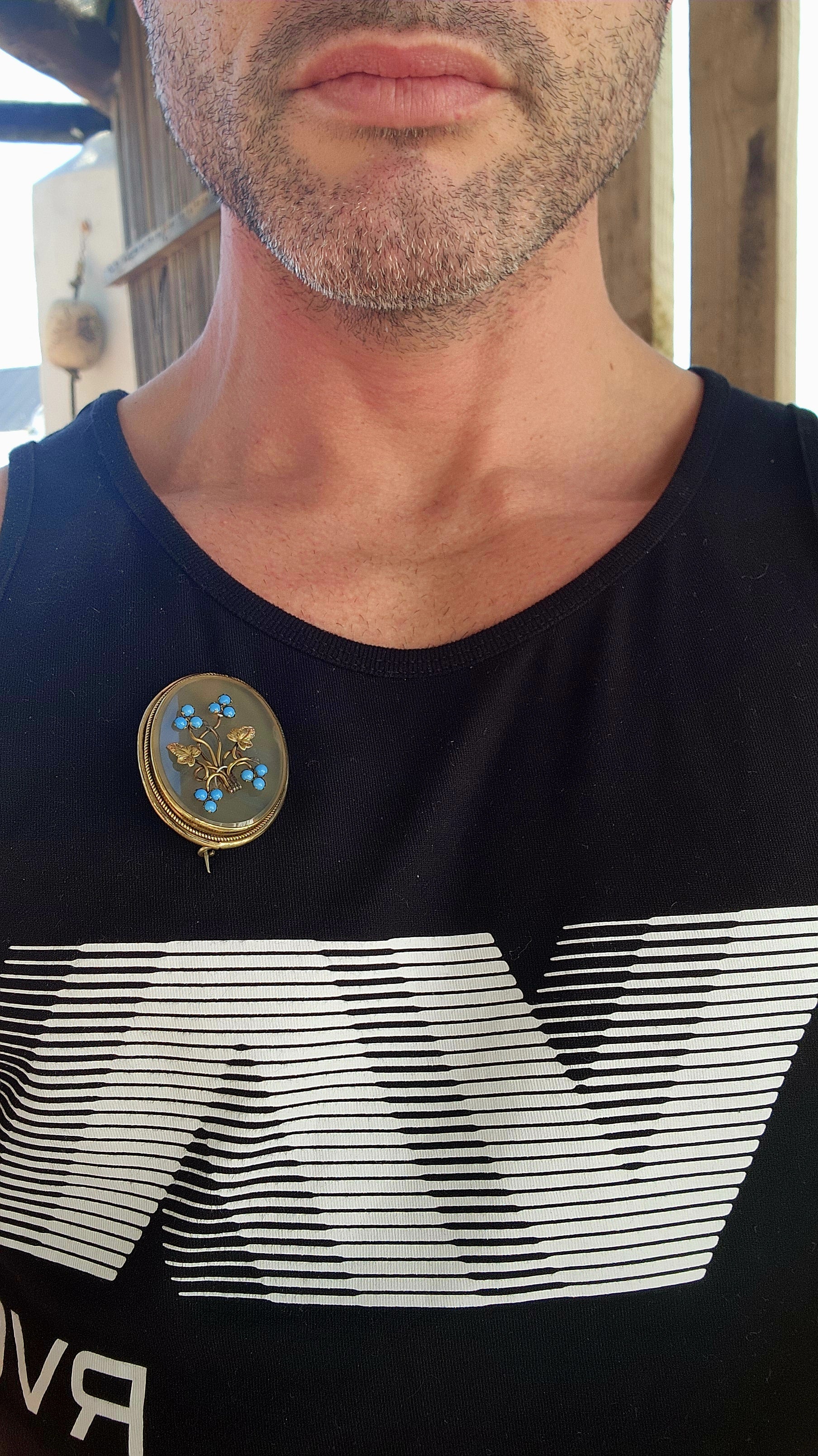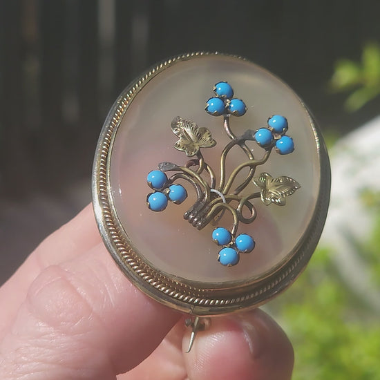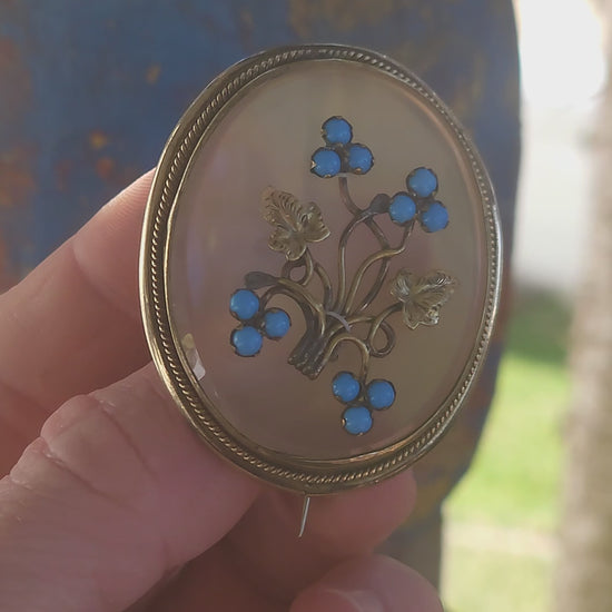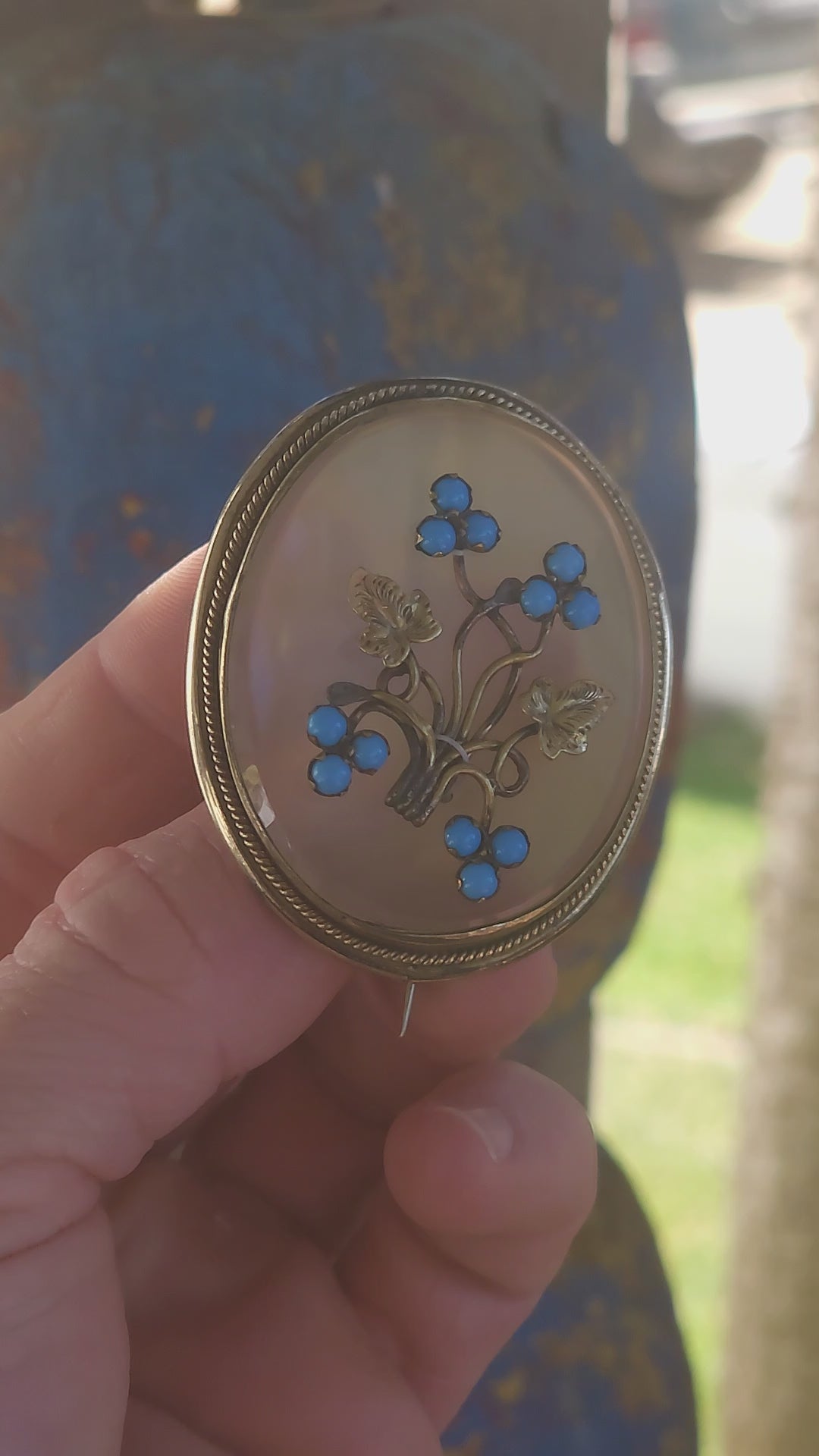 Pieces like this flourished during the early to mid-Victorian period (1837–1860), when sentimental jewelry was at its height. Brooches incorporating turquoise forget-me-nots were highly fashionable and often crafted in pinchbeck or gold, sometimes later converted to pendants or lockets. Surviving examples of this quality and size are now exceedingly rare, especially with all turquoise stones intact and vibrant.