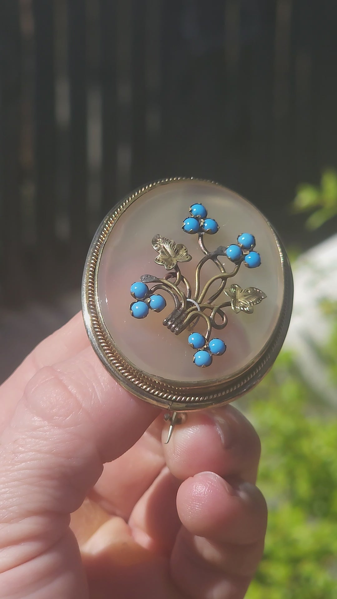 This exquisite piece is masterfully composed of a smooth oval cabochon of milky to translucent chalcedony, its gentle glow reminiscent of moonlight captured in stone. Mounted delicately upon the chalcedony surface is an intricate bouquet of forget-me-not flowers, crafted in fine metalwork and set with vibrant turquoise cabochons—each one perfectly domed and sky-blue, symbolizing eternal love and remembrance. The blossoms are accented with delicate gilt leaves and curling stems, forming a miniature botanical sculpture beneath chalcedony.