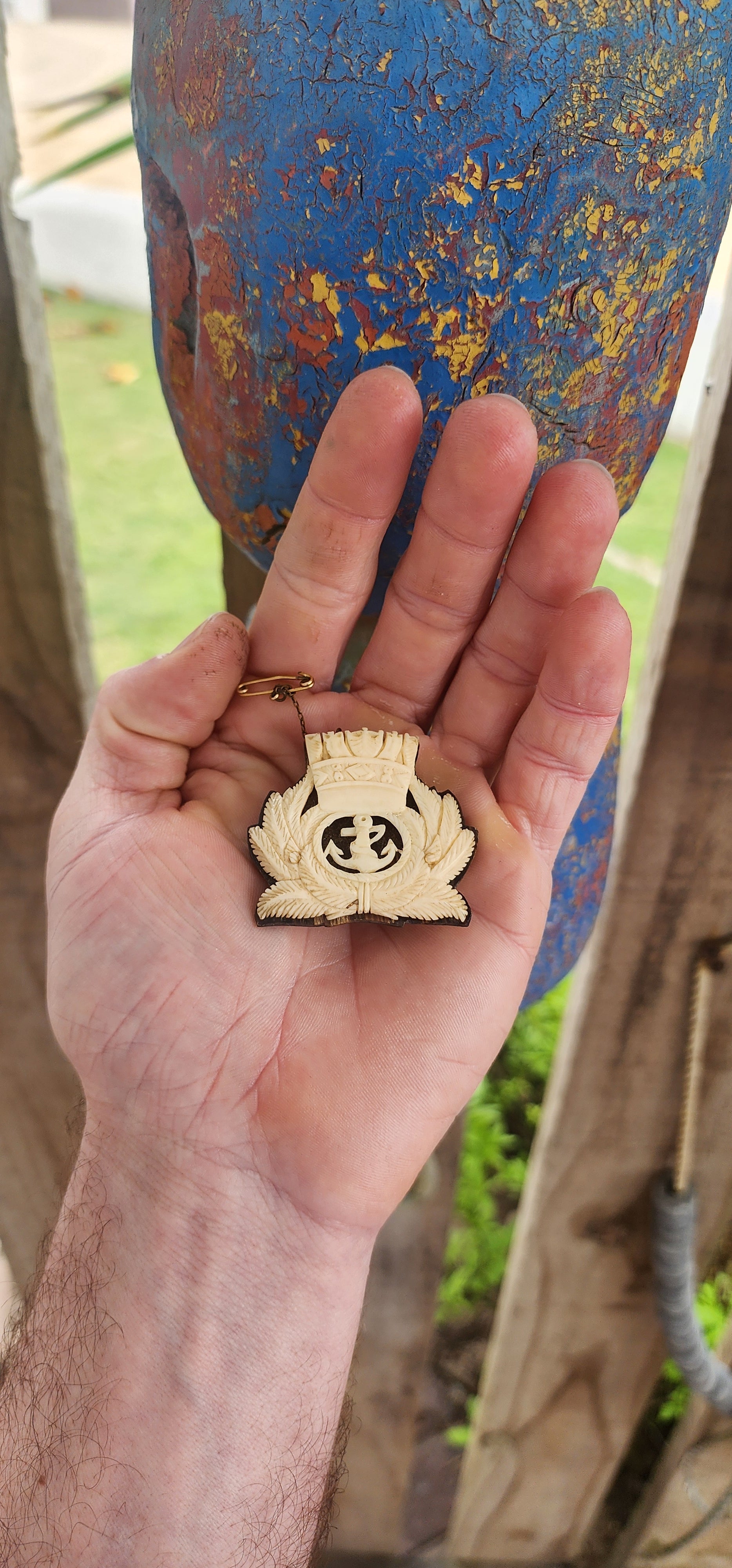 The emblem sits proudly on a hand-shaped dark horn backing, giving a dramatic contrast between the creamy ivory and deep brown horn tones. The reverse shows its original hand-fitted metal pin and safety chain attachment — a clear indicator of its artisan, sailor-made origin, likely crafted aboard ship or as a wartime keepsake for a loved one back home.