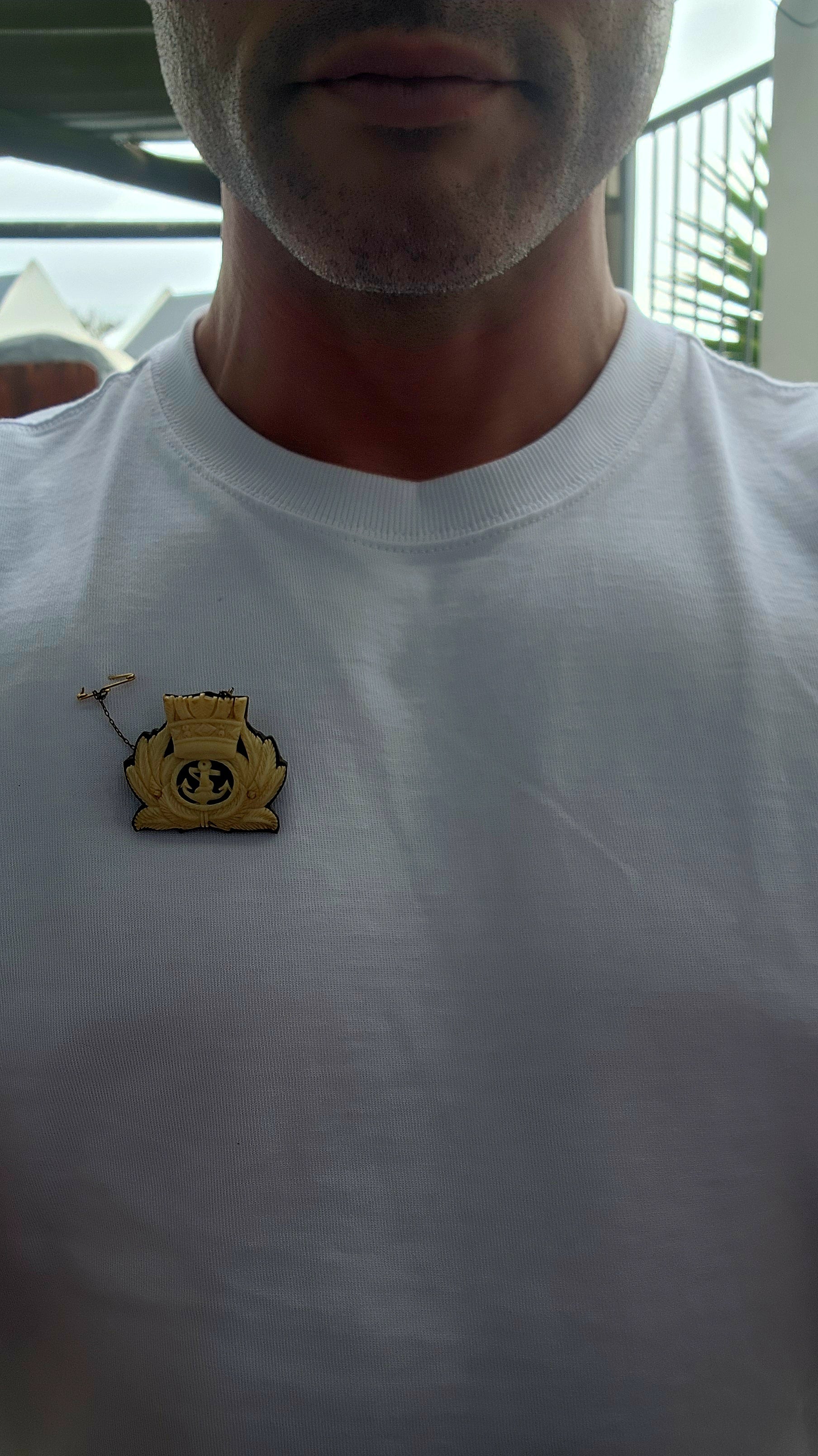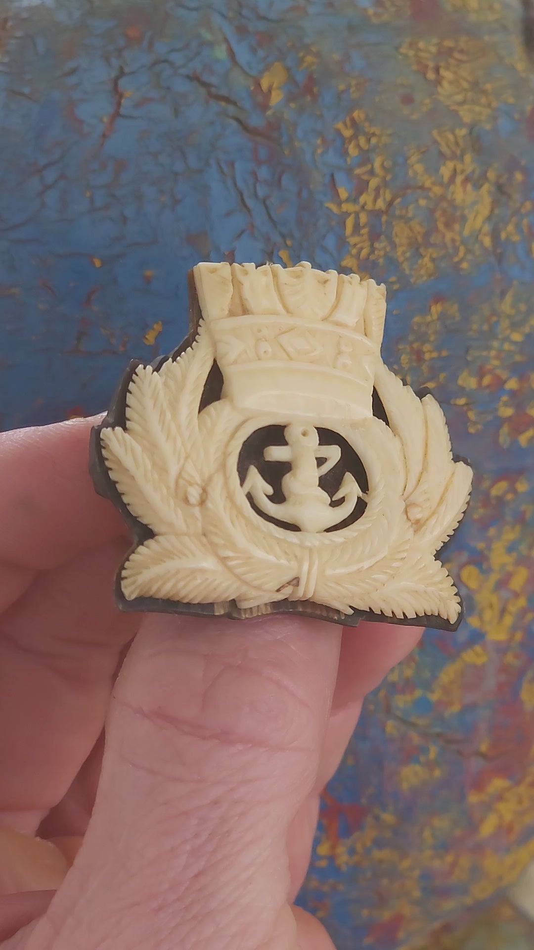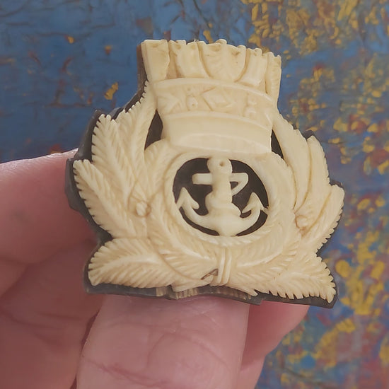 Up for grabs is one of the most exceptional WWII-era sweetheart brooches I’ve come across in ages! This circa 1939–1945 treasure features the South African Navy officer’s emblem — the classic fouled anchor surrounded by a laurel wreath and topped with a naval crown — meticulously hand-carved from pre-ban ivory in stunning relief detail.