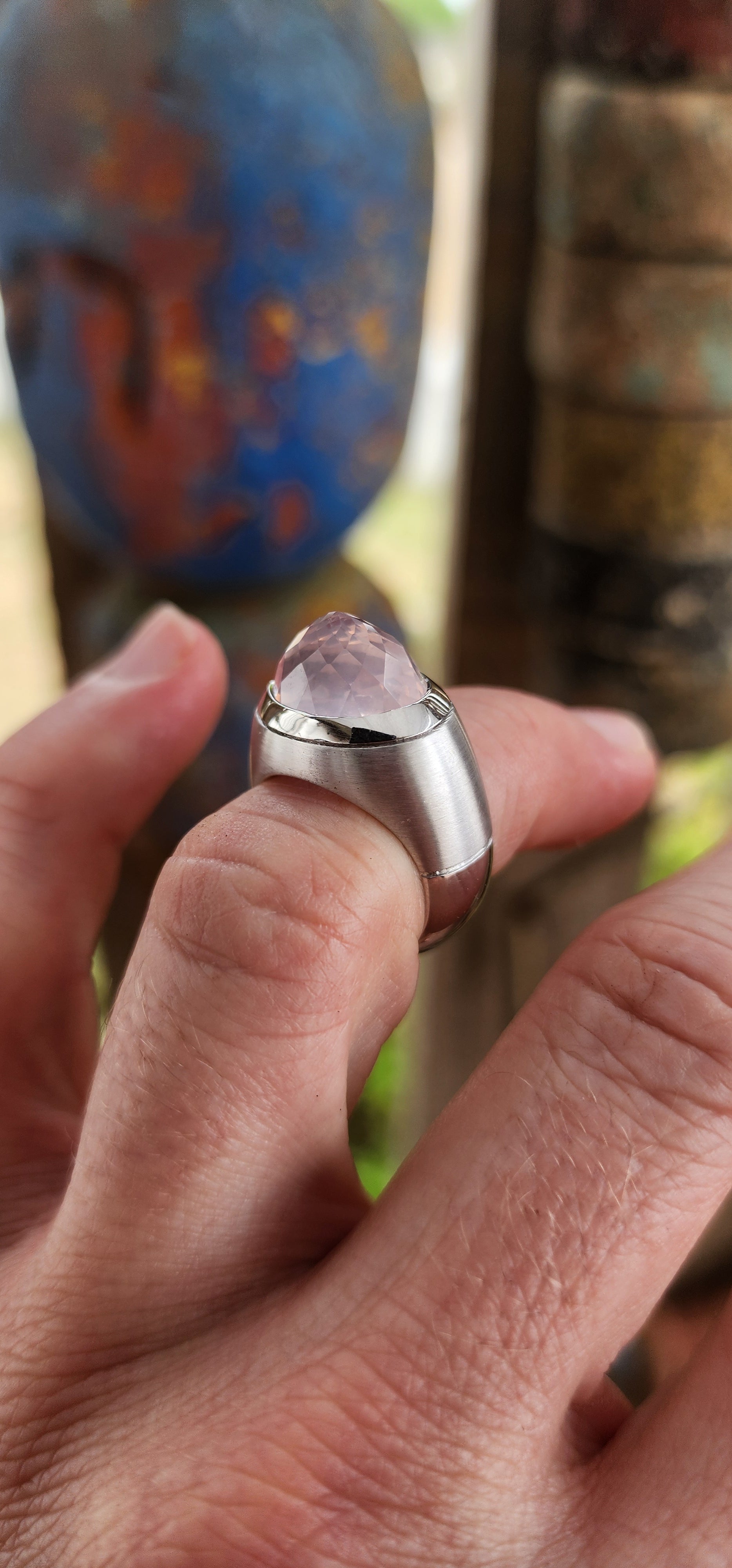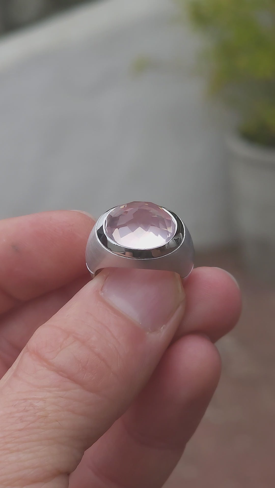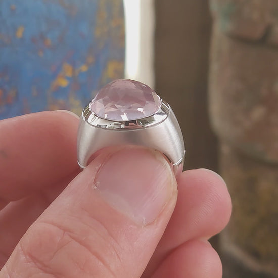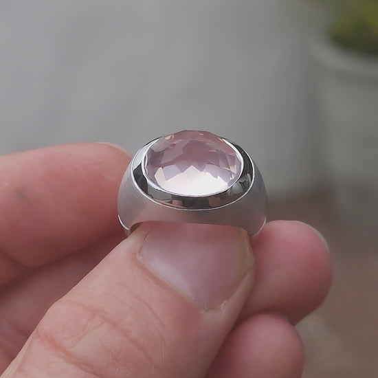 At the heart of the ring sits the true showstopper: a high-domed, reverse-set, faceted blush pink rose quartz, luxuriously tube-set in polished silver. The rose quartz appears to float within its setting, glowing with an ethereal, moonlit softness. Its reverse faceting creates unexpected depth and light play, giving the rose quartz a hypnotic, almost otherworldly presence—like a luminous planet suspended in orbit.