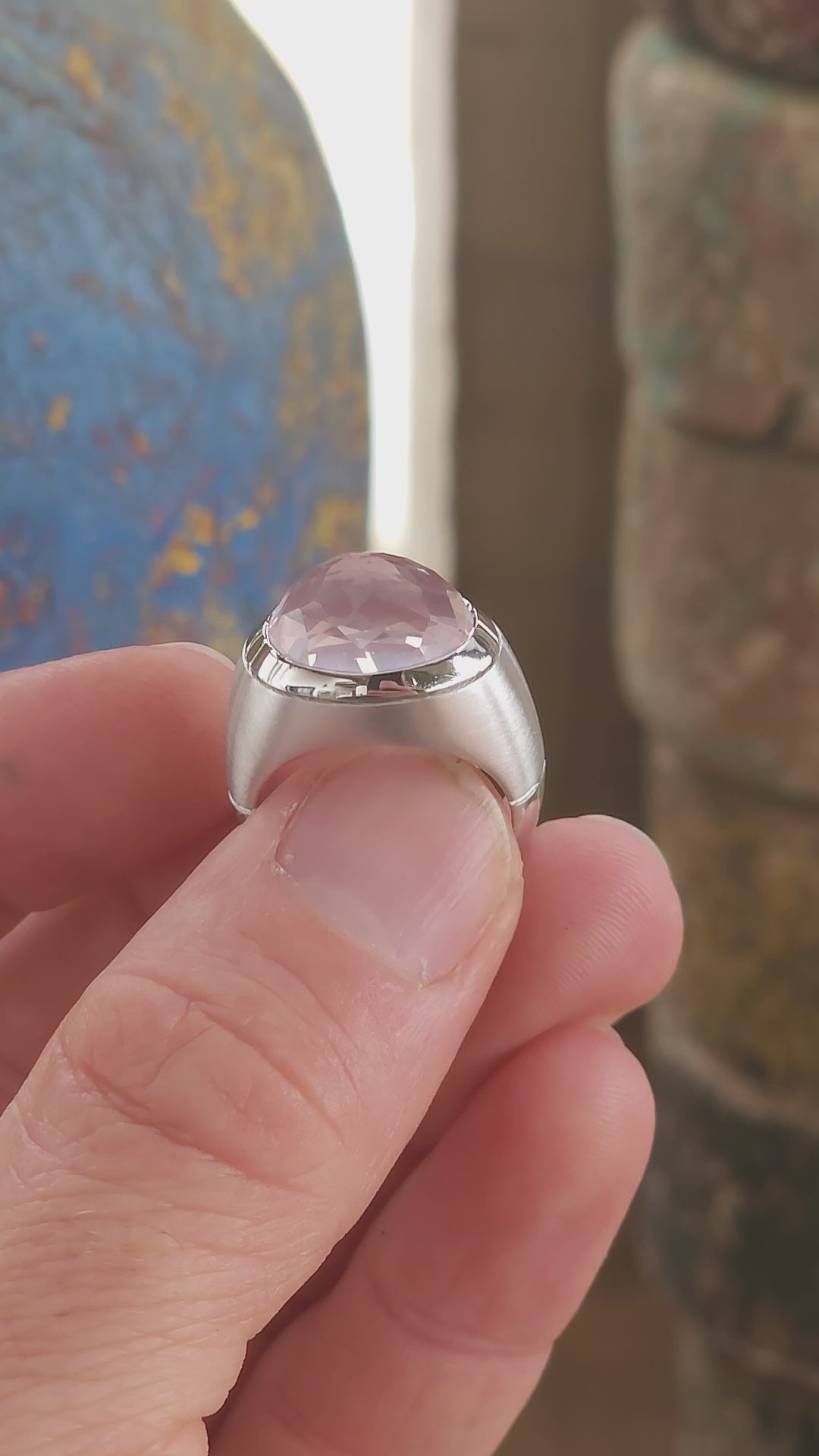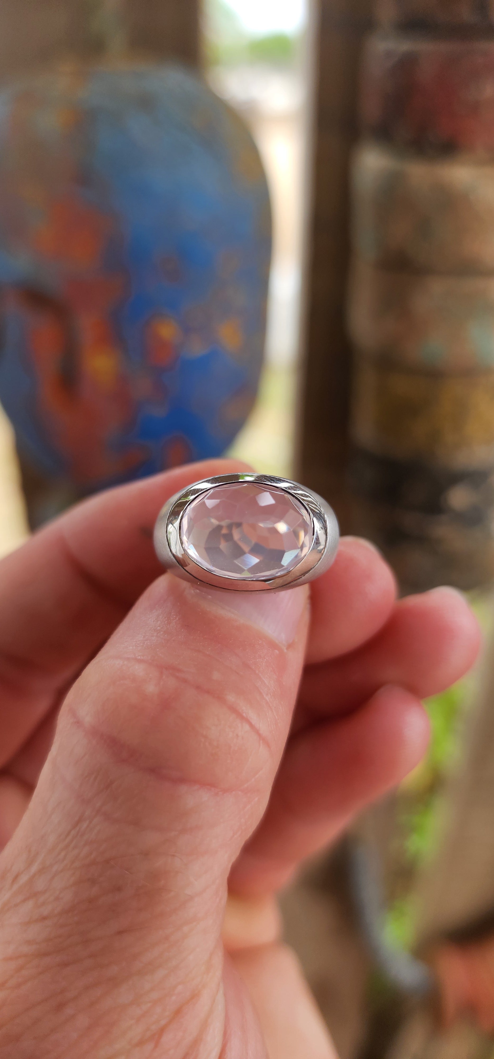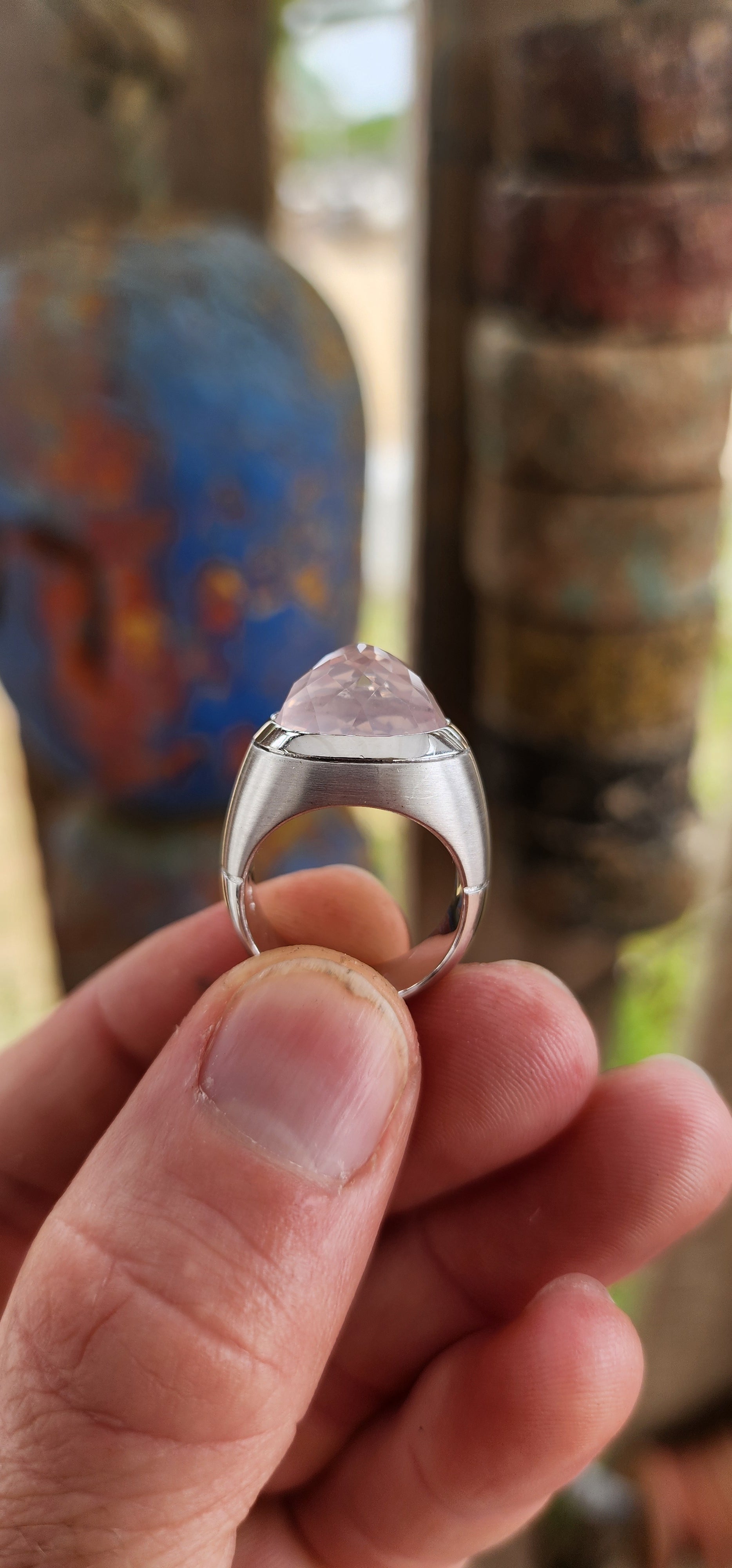 At the heart of the ring sits the true showstopper: a high-domed, reverse-set, faceted blush pink rose quartz, luxuriously tube-set in polished silver. The rose quartz appears to float within its setting, glowing with an ethereal, moonlit softness. Its reverse faceting creates unexpected depth and light play, giving the rose quartz a hypnotic, almost otherworldly presence—like a luminous planet suspended in orbit.