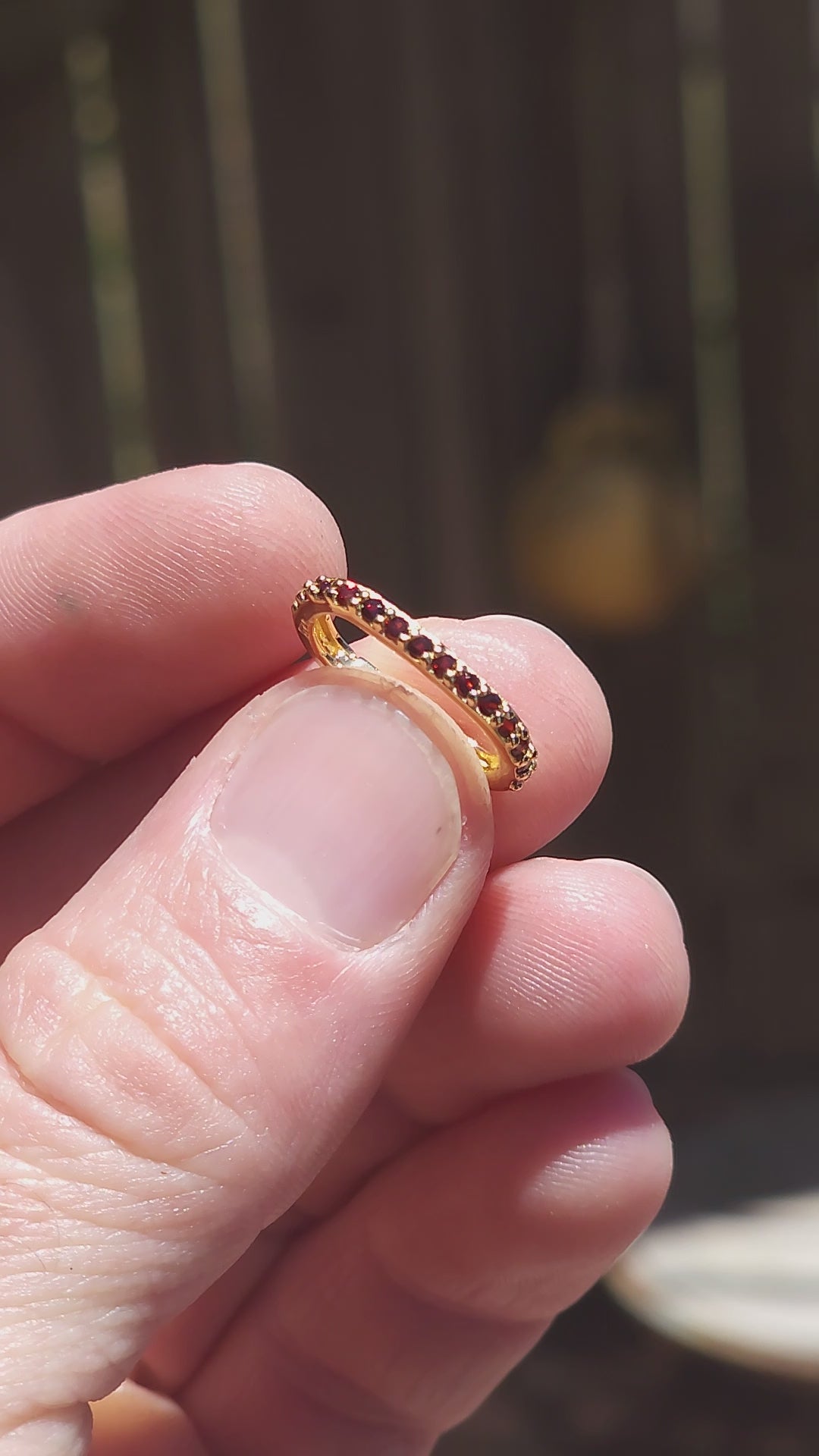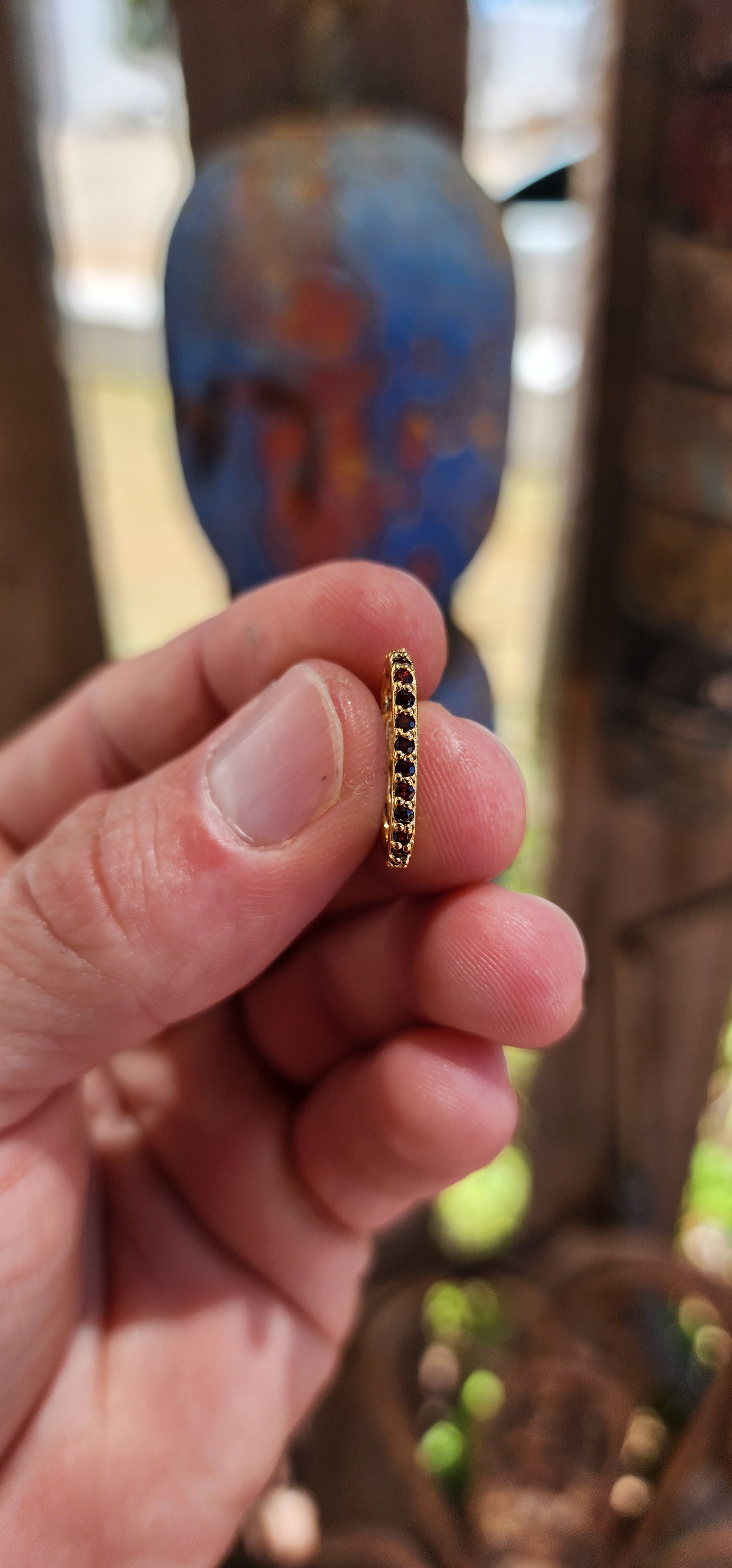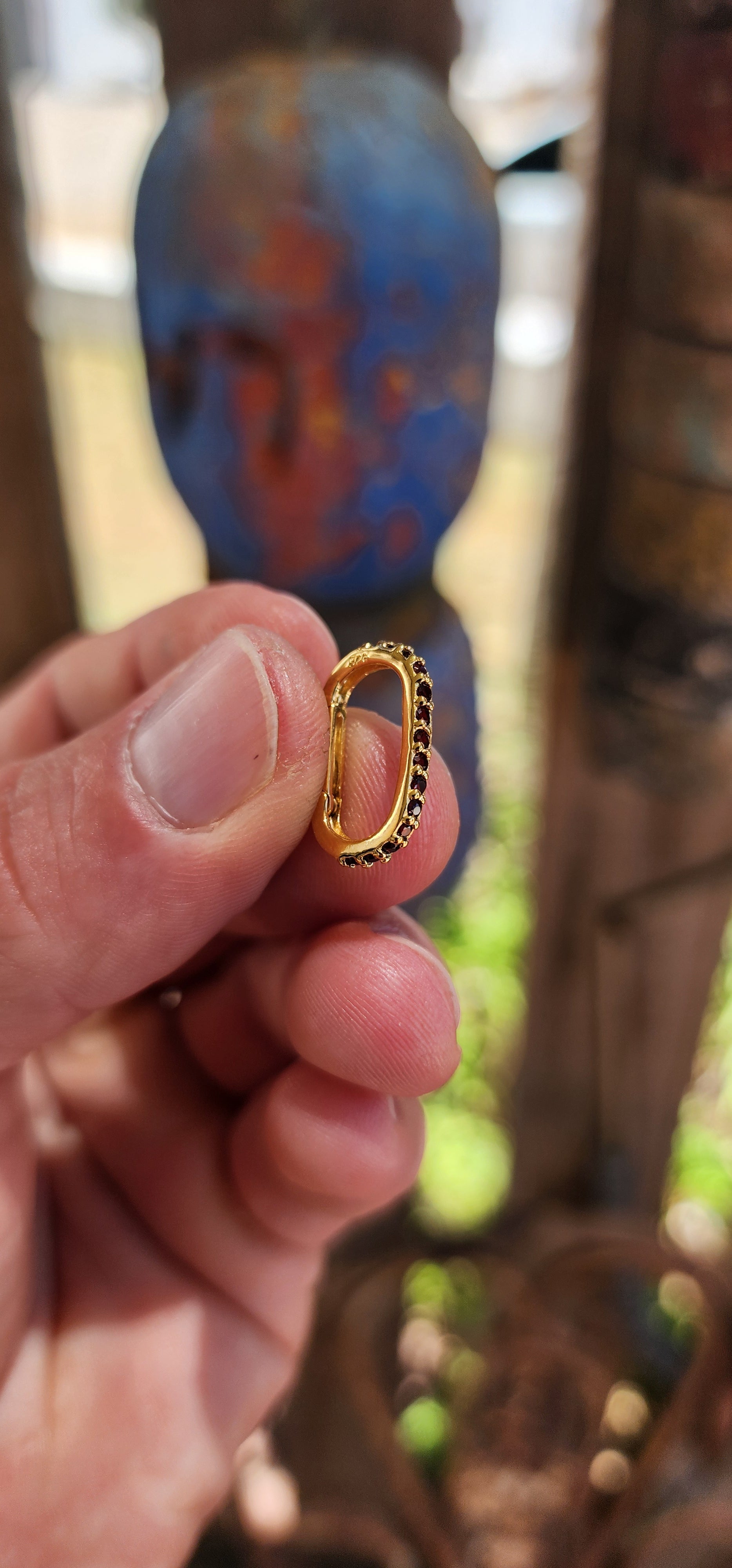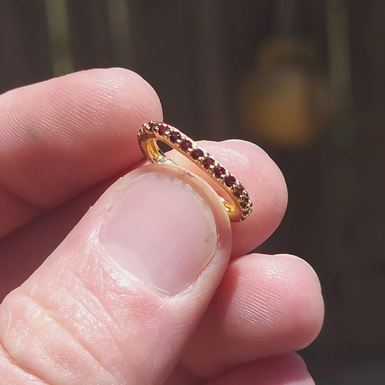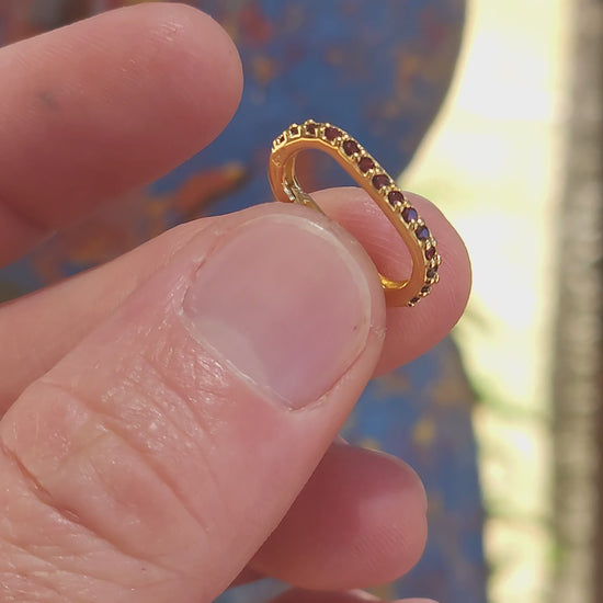 Crafted in solid sterling silver and luxuriously finished with 18ct yellow gold plating, the clasp is shaped in a sleek, softly rounded oval / carabiner silhouette that feels modern yet timeless. One half of the clasp — opposite the opening latch — is beautifully prong-set with tiny round-cut garnets, giving it that rich, wine-red sparkle that looks almost ancient and regal against the warm gold finish.