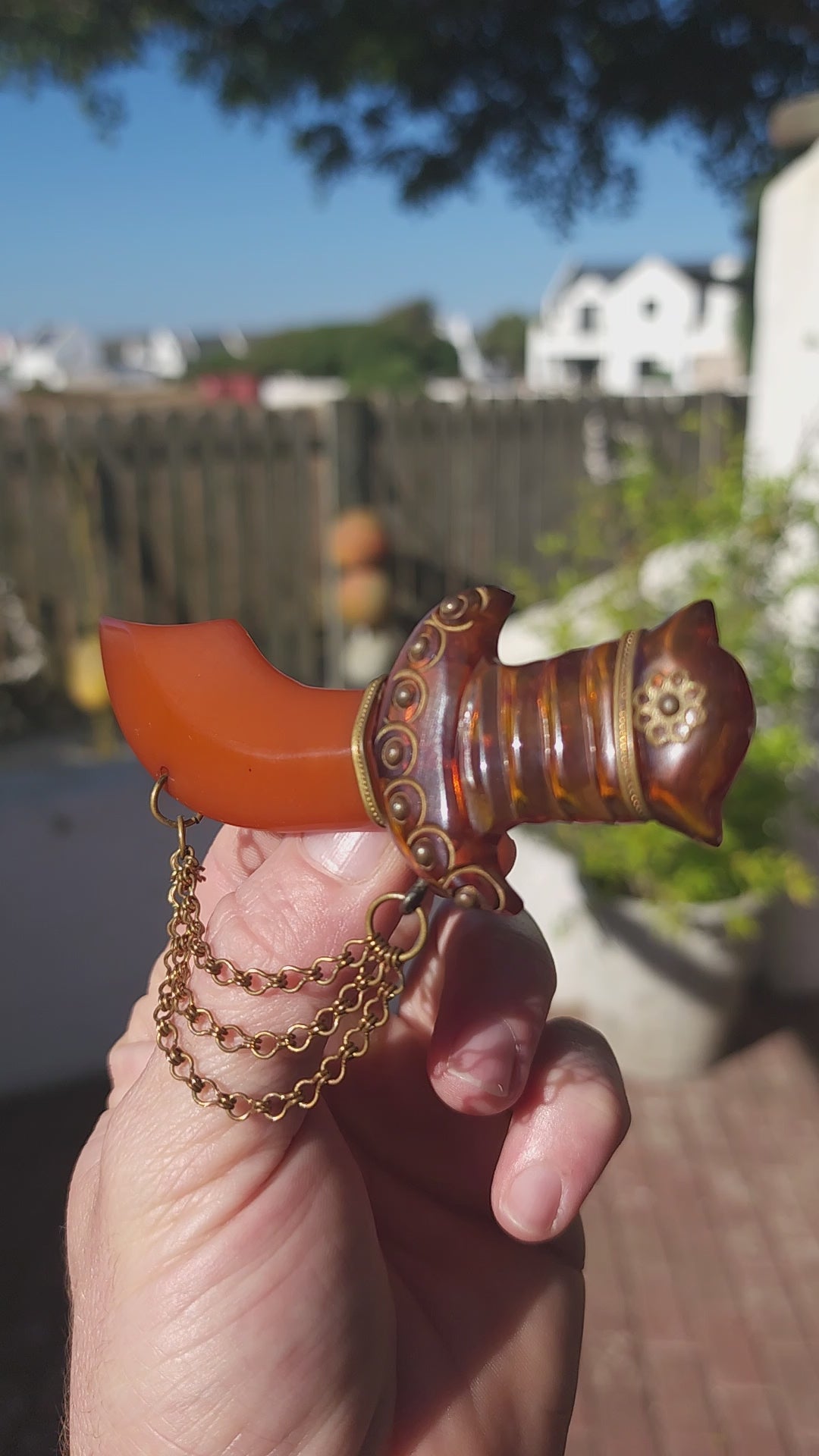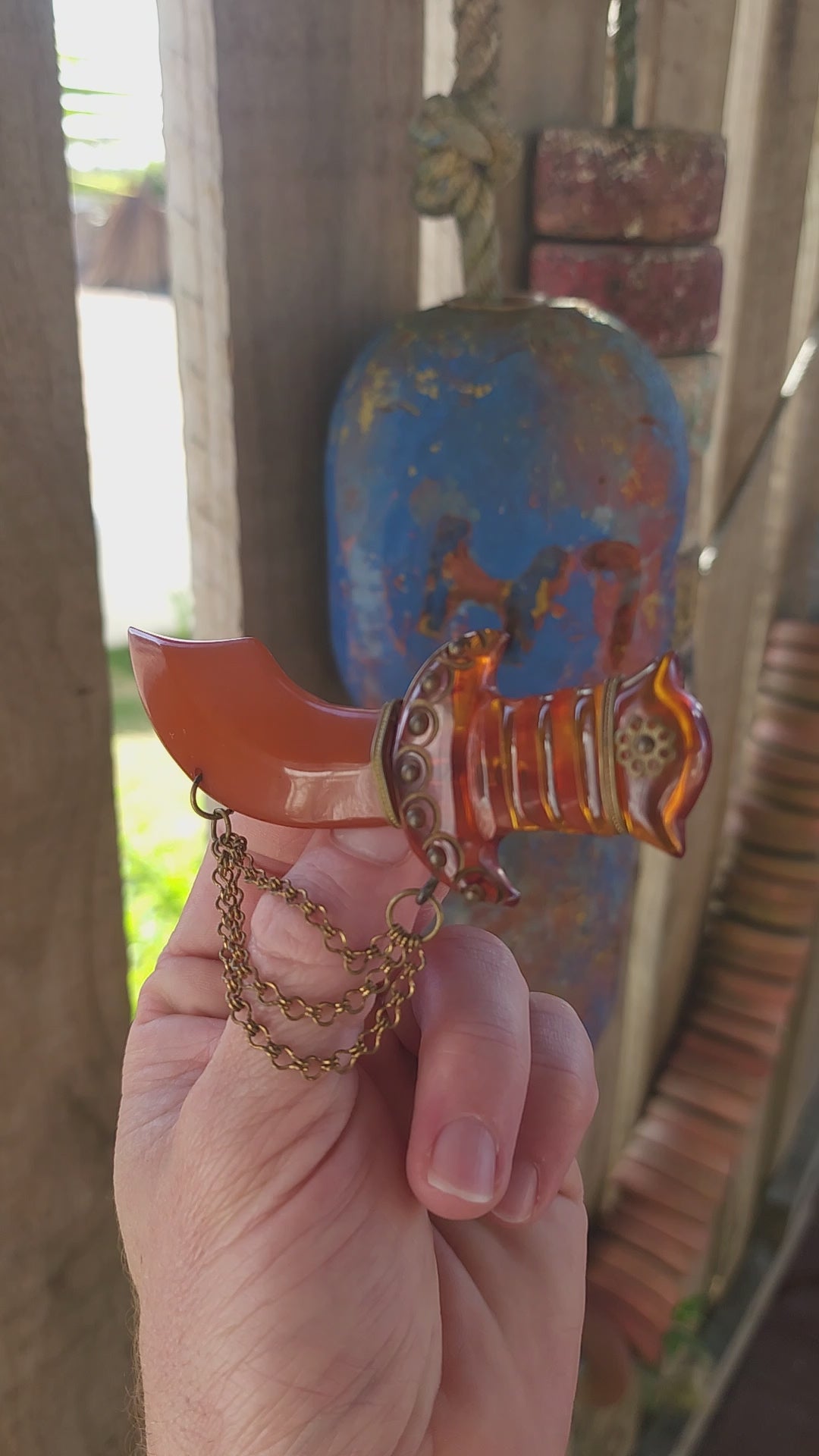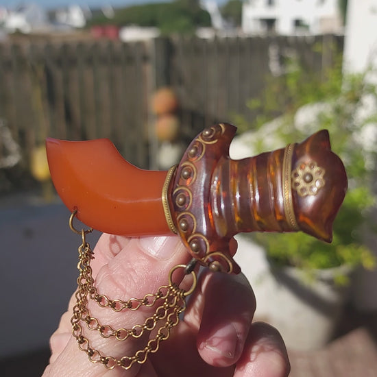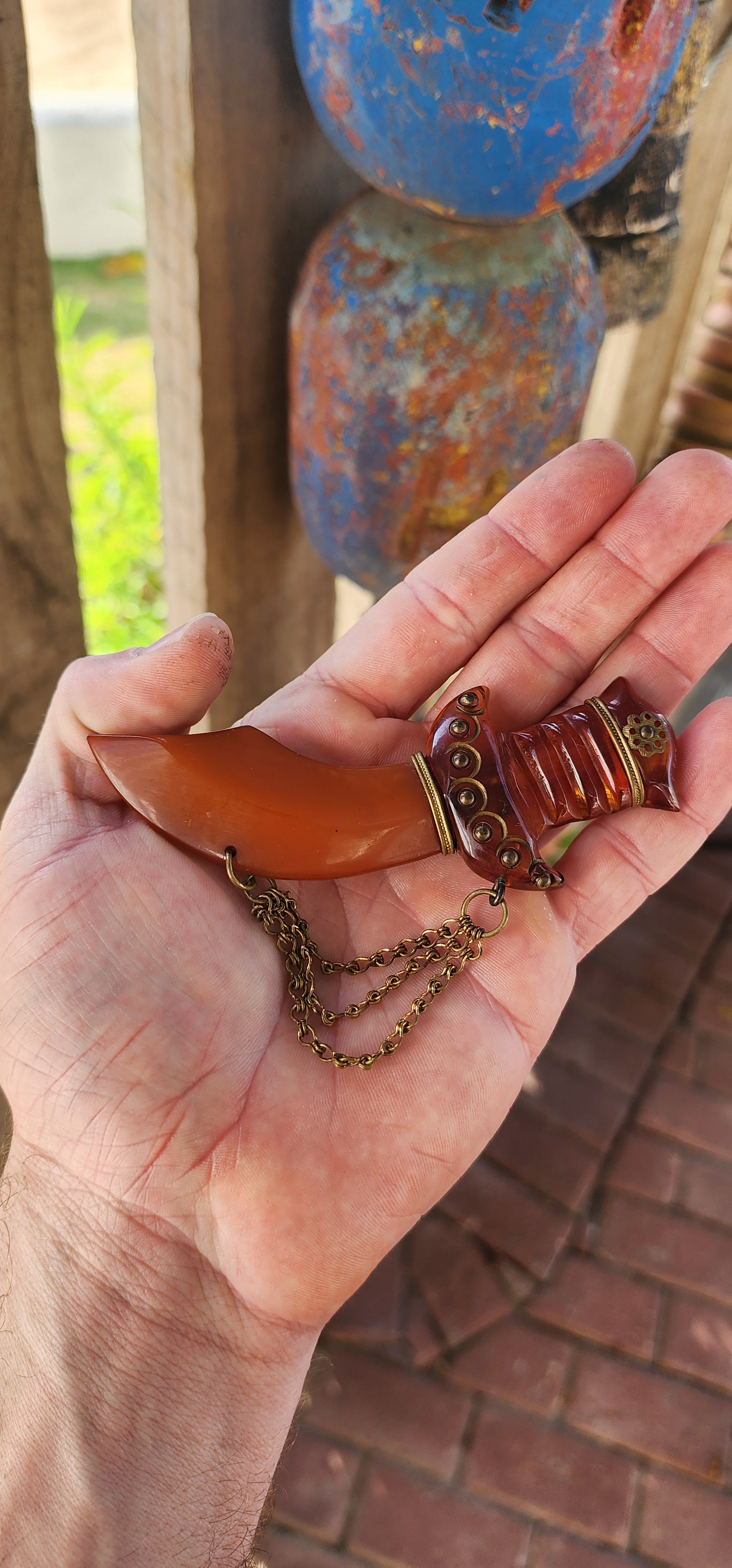 Be still, collector hearts! Up for admiration is a marvelous and oversized Art Deco–era novelty brooch, exquisitely carved in the exotic form of a Persian dagger (khanjar) — a highly desirable motif in vintage Bakelite jewels of the 1930s.